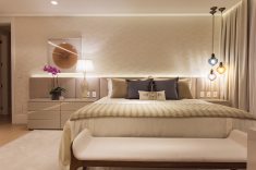 Nas suítes, a personalização chama atenção. Cada um dos quartos foi projetado de forma que atenda aos gostos e necessidades dos seus ocupantes. Para os mais novos, tapetes temáticos, desenhados pelo Studio, e desenhos na parede garantem personalidades diferenciadas. Na suíte máster, o papel de parede Tessuto, com relevos em veludo, dão um toque de sofisticação. Confira todas as fotos na nossa galeria!