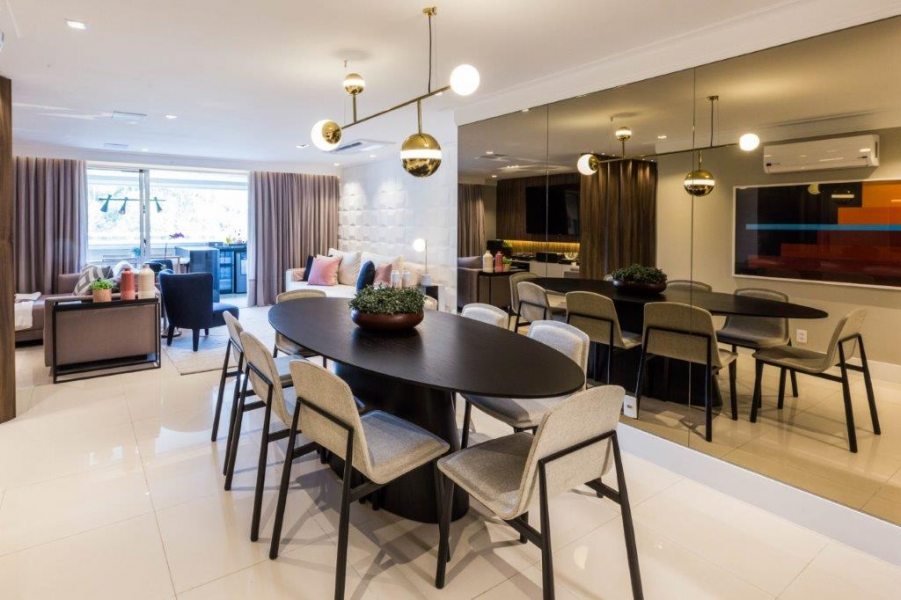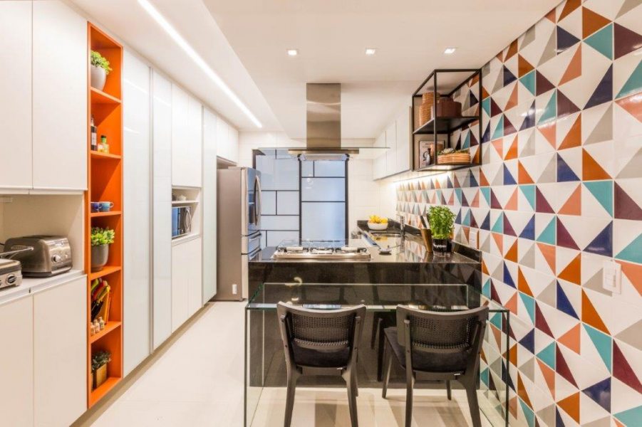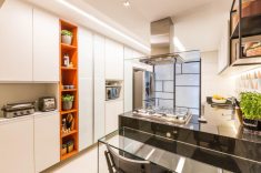 Para integrar a sala de jantar, a arquiteta removeu a parede que delimitava a cozinha. Além disso, outro grande desafio deste projeto foi deixar a cozinha mais clara, agradável e bonita, pois no projeto original, o espaço era escuro, com piso preto e sem janela, com uma iluminação natural. Com a junção dos ambientes – sala de jantar e cozinha – ainda foi possível criar um painel que possibilita a integração com a sala de jantar, mas ao tempo, preservado a intimidade da cozinha, quando necessário.