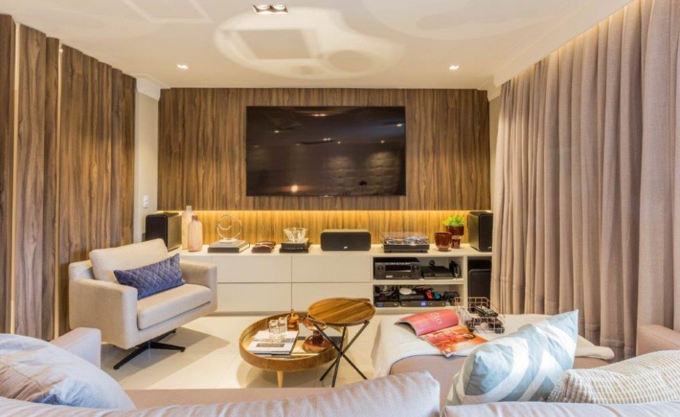O projeto de iluminação concebido pela Labluz, foi pensado exclusivamente para deixar o apartamento mais claro, mas ao mesmo tempo, intimista, com iluminação indireta, que destaca os painéis de brise utilizado na sala. Confira mais fotos na galeria!