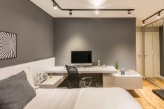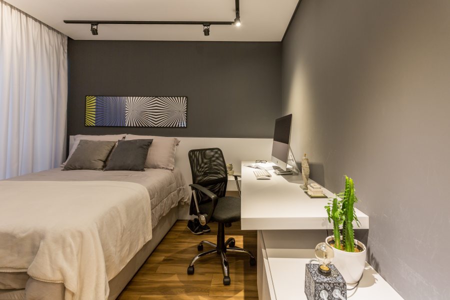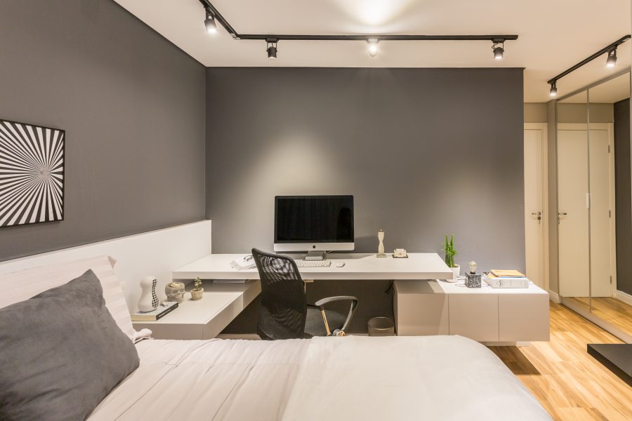 A suíte do rapaz conta com um trilho eletrificado com spots direcionáveis que juntam com a parede escura.