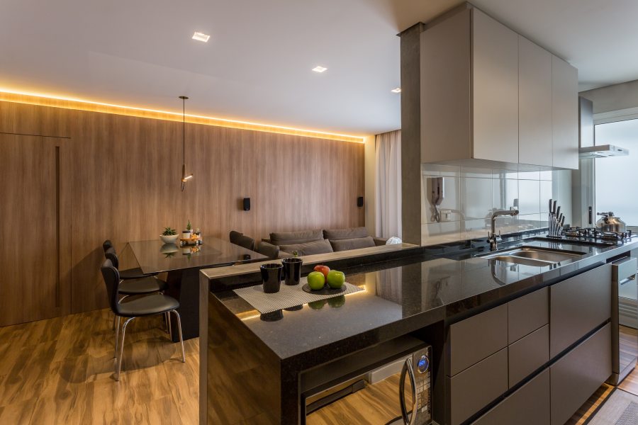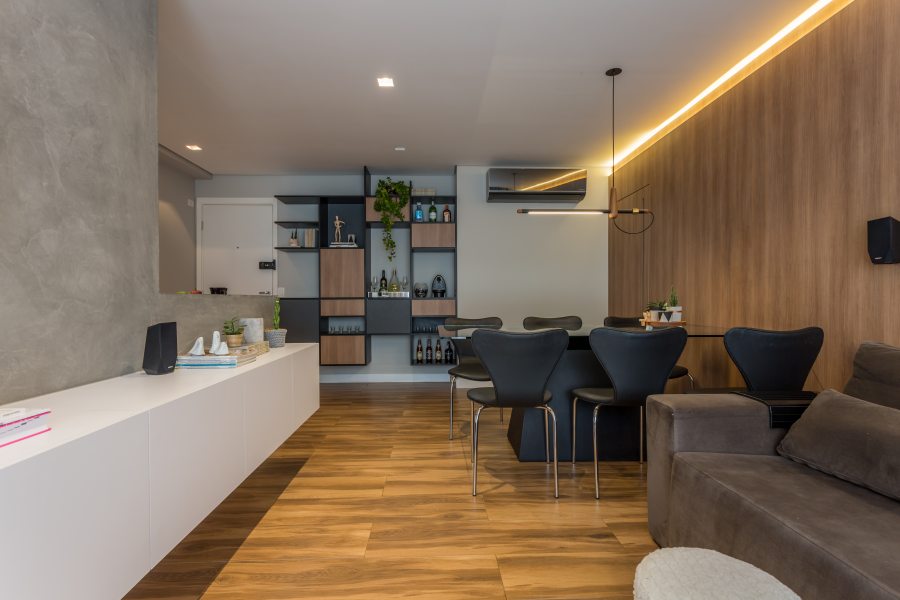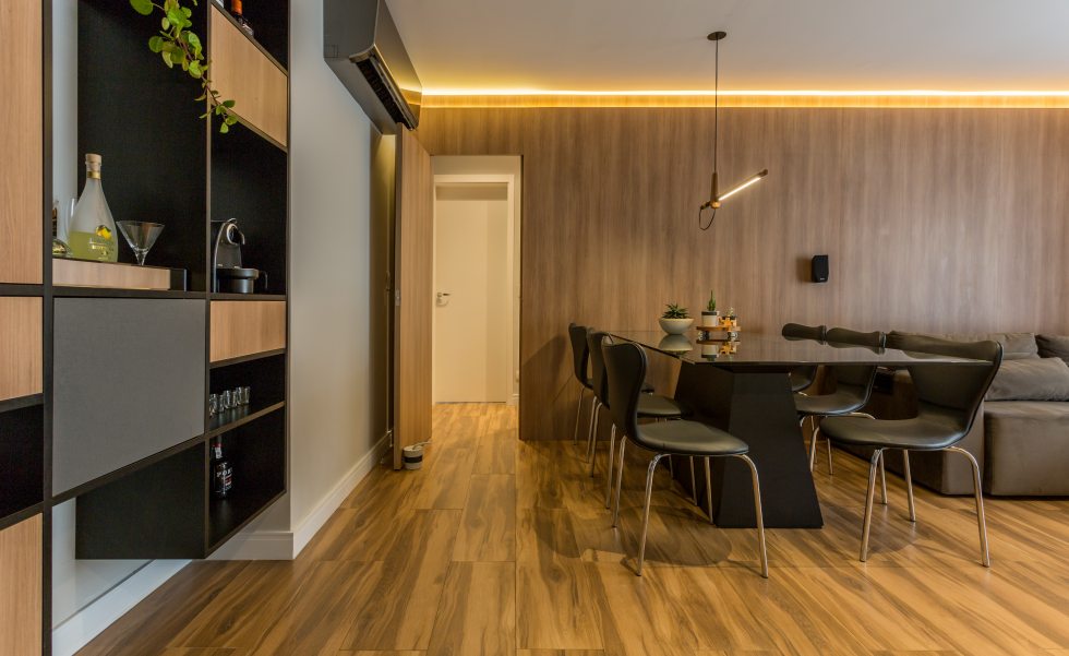 O apartamento foi entregue apenas com forro de gesso e piso nas áreas molhadas. As arquitetas Heloísa Savoldi e Jessica Leoni, da Lumi arquitetura, optaram por tirar o porcelanato para remover a divisão entre sala e cozinha. Um porcelanato amadeirado foi colocado no lugar.