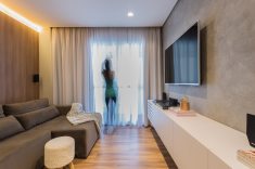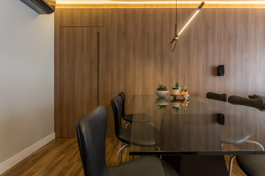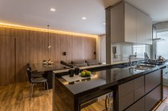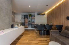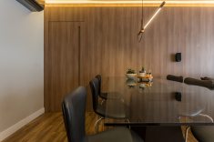 Para o projeto deste apartamento, no Bigorrilho, em Curitiba, foi priorizada a integração dos ambientes, para o casal de irmãos receber convidados, mas sem perder a privacidade. Para isso, o apartamento foi dividido em área social e íntima, através de um painel em marcenaria que também faz pano de fundo da sala, e tem seu lado oposto um roupeiro e sapateira.