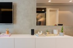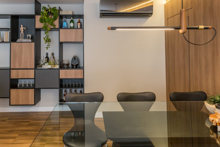 Para otimizar o mobiliário, o móvel da TV também pode ser usado como buffet, e a estante multifuncional serve de aparador de entrada, bar e café.