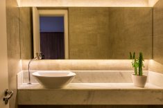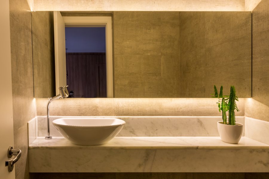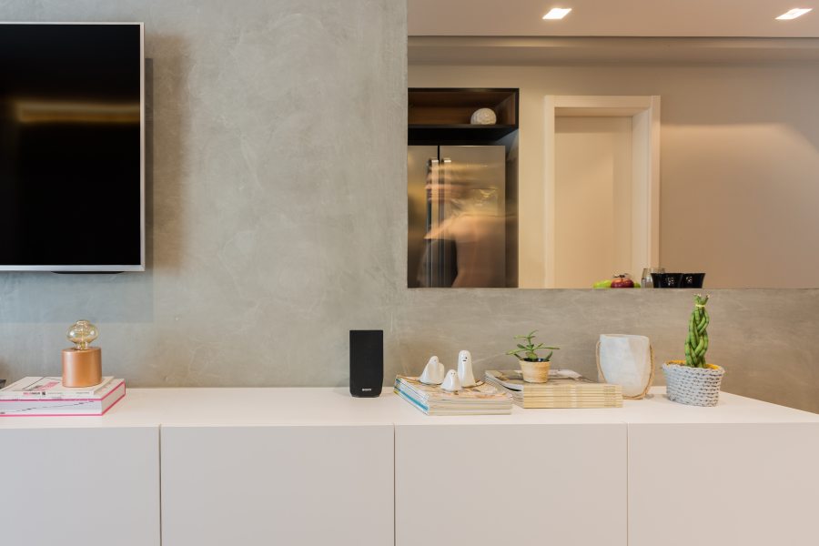 Para dar destaque ao móvel branco, na sala, a parede ganhou textura de cimento queimado, que também aparece no lavabo.