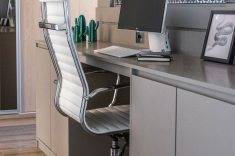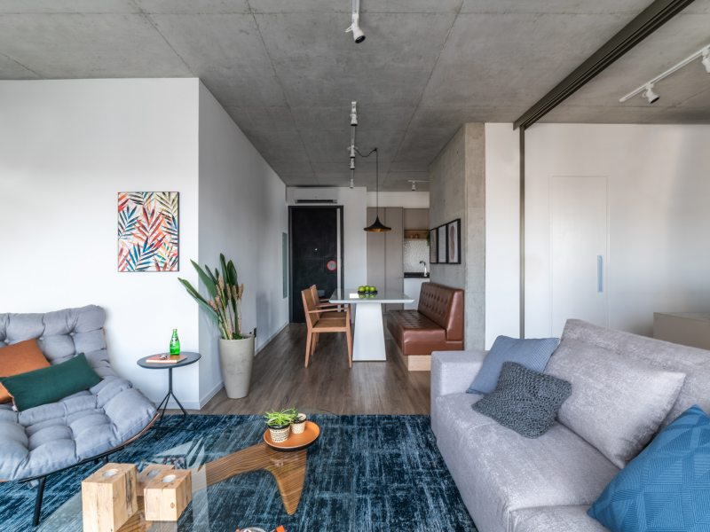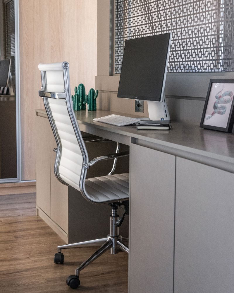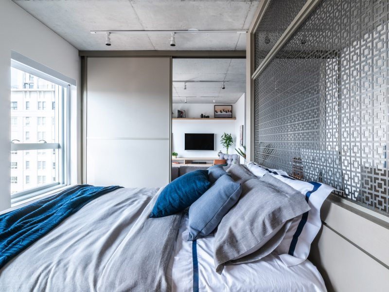 Para realizar o desejo dos moradores de conectar parcialmente o quarto e área social, a arquiteta apostou em portas corrediças entre o quarto e a sala. Esse foi, sem dúvidas, o maior desafio dentro do quesito orçamento: "Levou um tempo até chegarmos nessa solução que coube no bolso e nos agradou (muito!) esteticamente. Nossa preocupação era fazer uma divisória durável, com um visual bacana e uma ótima relação custo x benefício", detalha Júlia. Nas costas da cabeceira da cama, o painel de aço perfurado mantém a privacidade e 'conversa' com o concreto aparente presente no apartamento. De quebra, a solução ainda deu espaço para um home office completovoltado aos momentos em que o casal precisa trabalhar em casa.