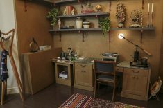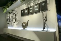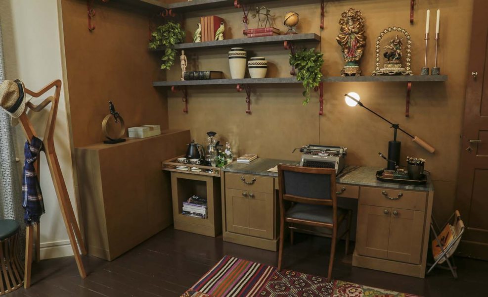 O espaço da Gouveia & Bertoldi optou pelo uso do Golden e do Nimbus em painéis, pranchas e na escrivaninha retrô. Trata-se de um espaço em tons dourados, bege e preto, inspirado no poeta catarinense Lindolff Bell.