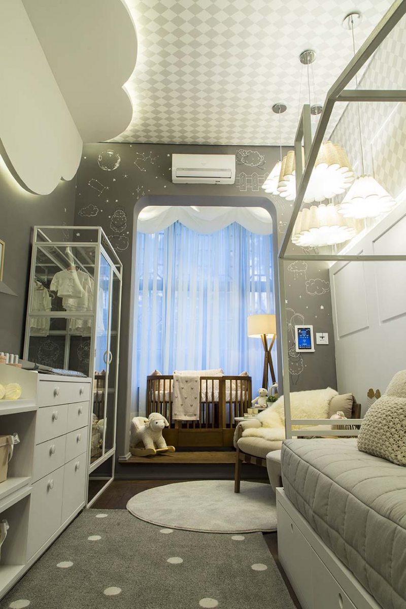Roberta Medina, da Schaffen Arquitetura, pensou o espaço com os padrões Lino Piombo e Tabaco, aplicando-os na forração, cabeceira da cama e frente das gavetas.
