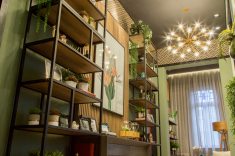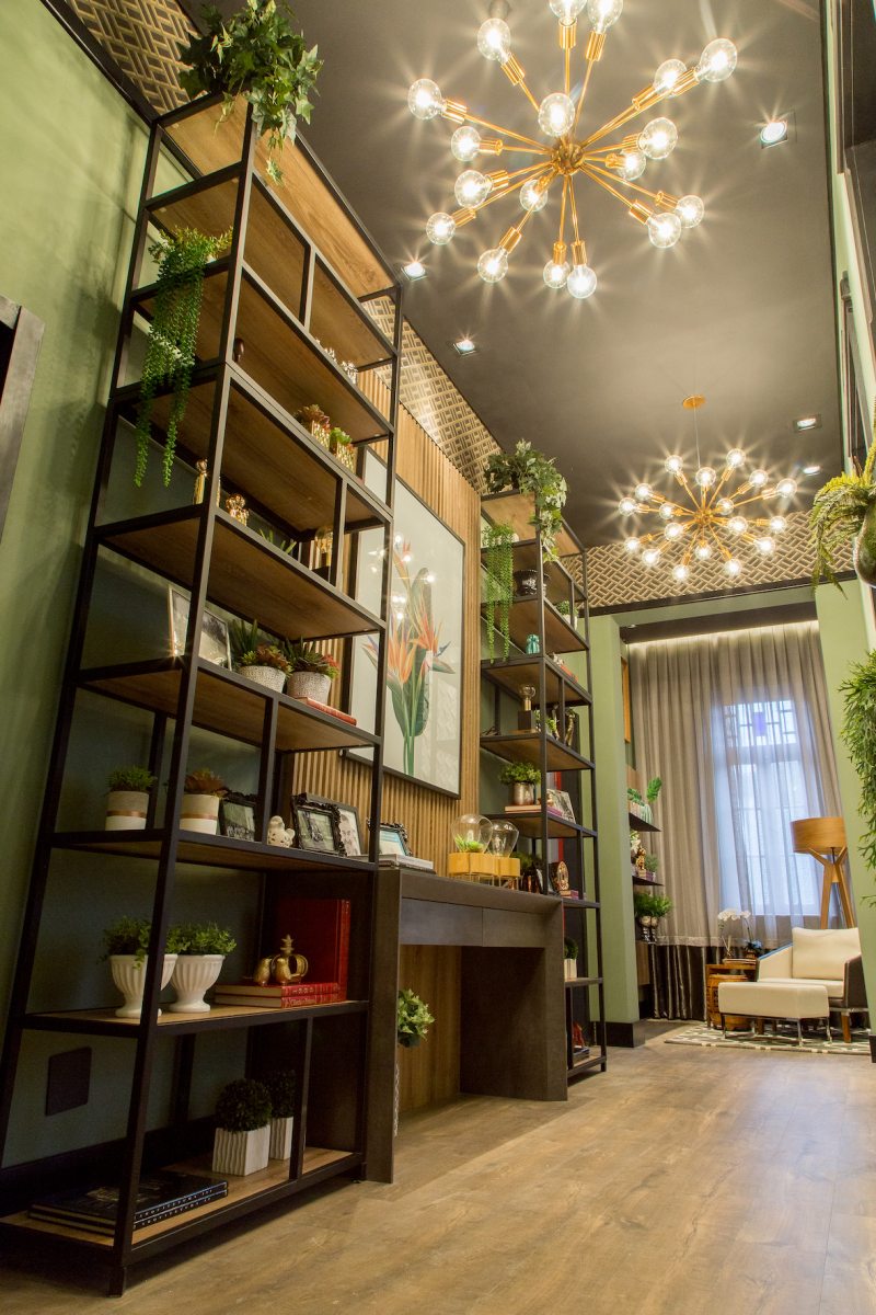 Os padrões Nimbus e Mezzo Castani são utilizados em dois painéis horizontais, base de prateleiras metálicas, e em 18 prateleiras de duas estantes metálicas, além de um aparador chanfrado. A cartela de cores aposta na mescla do preto, verde e amadeirado, com inspiração histórica.