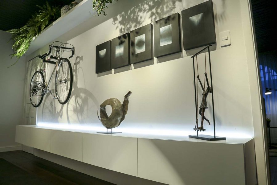 Assinado por Carina Manke, o Hall da Ciclista tem os padrões Branco Platinum e o Concreto Decor no móvel baixo com gavetas e no banco.