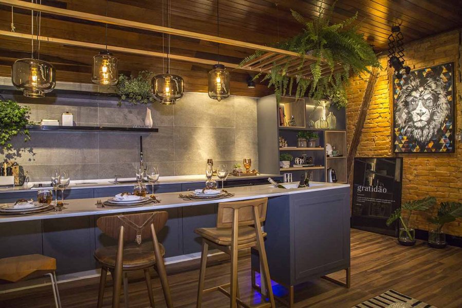 Inspirado no estilo industrial, com características primárias das construções expostas, o espaço utilizou os padrões Autentic e Grafen no móvel aéreo, painéis de sacada e bancadas da pia e da ilha. Concebido pela In9ve Arquitetura, o espaço de 15m² tem cores em tons de cinza com o toque da madeira do Autentic e um cinza azulado nas paredes.