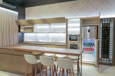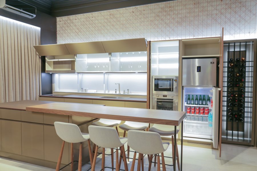 Com padrões Ébano e Argila, a Vivacità Interiores apostou em uma nova tendência: a linha “new optics”, que consiste em uma cozinha que se camufla, com geladeira oculta por uma porta escamoteável.