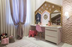 Padrões Noce Naturale e Gabric estão presentes nos armários, bancada de estudo e cana, cujo formato remete a uma casa. “A moldura dos espelhos também contou com o trabalho da Arauco, com tons neutros em um projeto cujo objetivo é transportar a criança para um universo lúdico e infantil”, detalha Fernanda Pereira, da Vitral Arquitetura.