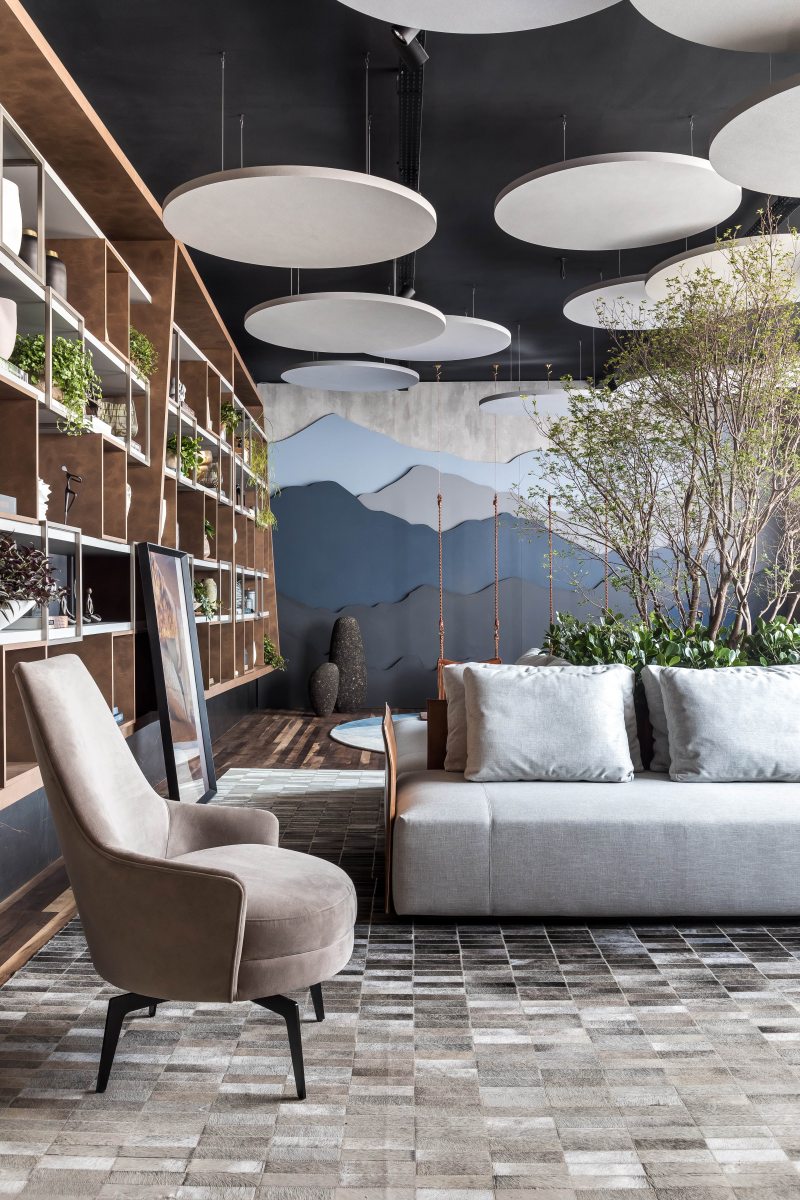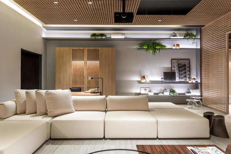 "A intenção é criar uma ilha de conforto e aconchego, um refúgio de descanso e descompressão para os atribulados dias atuais", comenta Felipe Guerra, que assina o projeto. A arquibancada, feita inteiramente com painéis da Arauco, desenrola-se de forma assimétrica, criando um elemento cênico central no ambiente, que se completa com a instalação paisagística da artista Manu Daher.