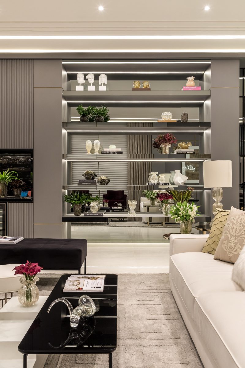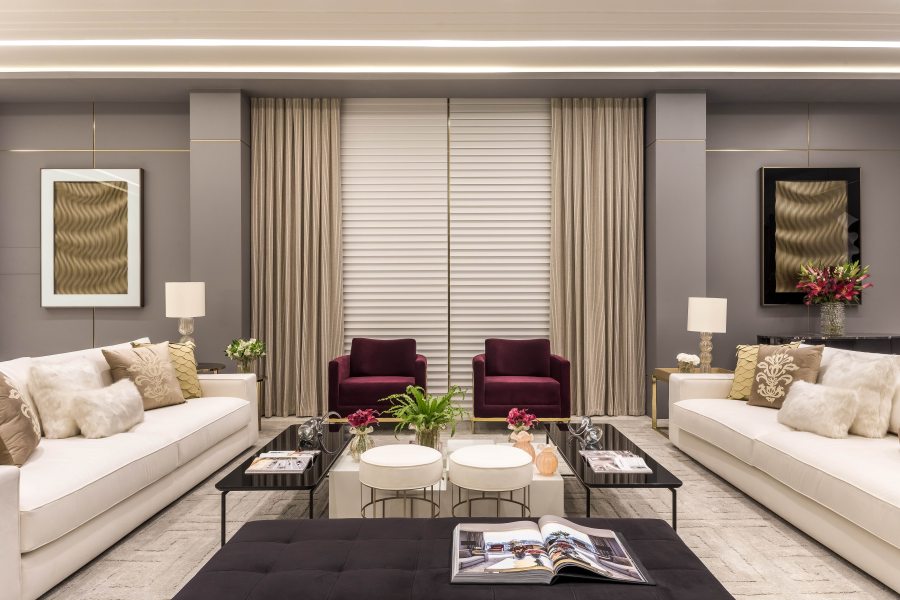 Ambiente criado com o estilo neoclássico, uma característica do escritório responsável pelo projeto. É um espaço sofisticado, que leva tons brancos e acinzentados, com destaque para o padrão Cinza Puro da Arauco. No ambiente amplo, o tom vinho das poltronas centrais são o ponto de cor.