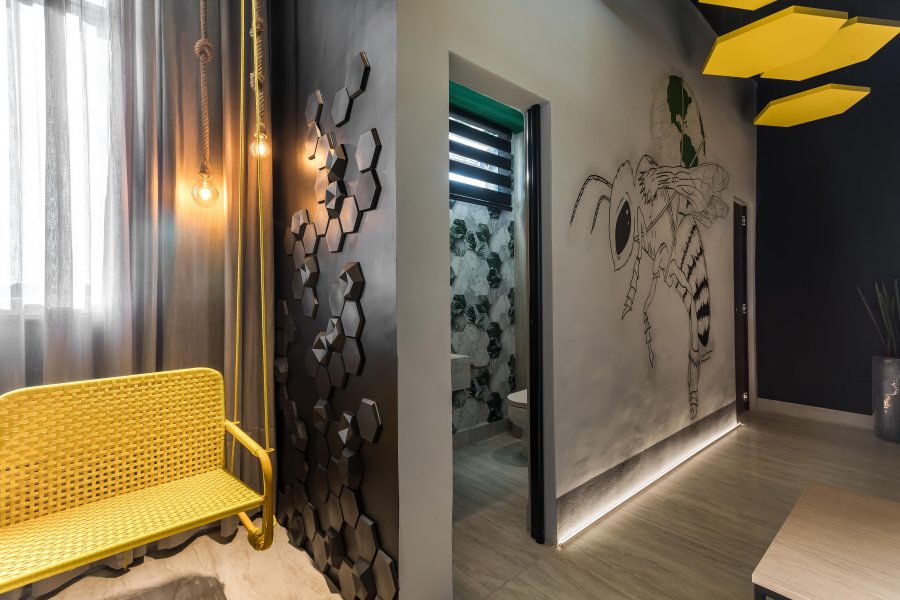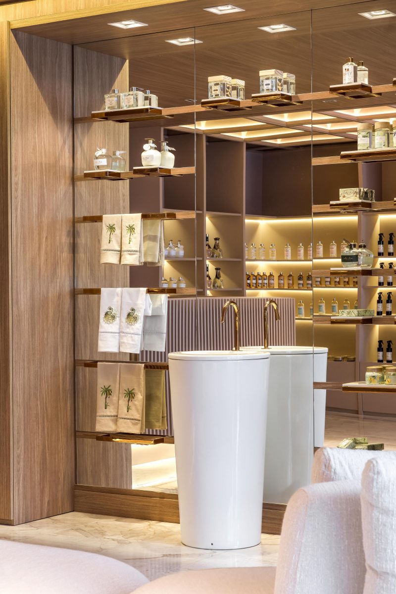 Os banheiros trazem linhas que evidenciam a natureza, como um jardim vertical e um teto que se assemelha a nuvens. Os produtos Arauco estão em painéis nas paredes do hall, no lavabo feminino e no masculino, que remetem a florestas.