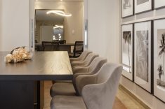 Para a sala de estar, com oito lugares, a profissional escolheu uma mesa em tom de ébano e confortáveis cadeiras revestidas em veludo cinza. O design moderno das peças complementou perfeitamente as obras de arte expostas na parede da sala de jantar – uma coleção que é orgulho dos moradores e ponto de partida de animadas conversas durante os eventos sociais.