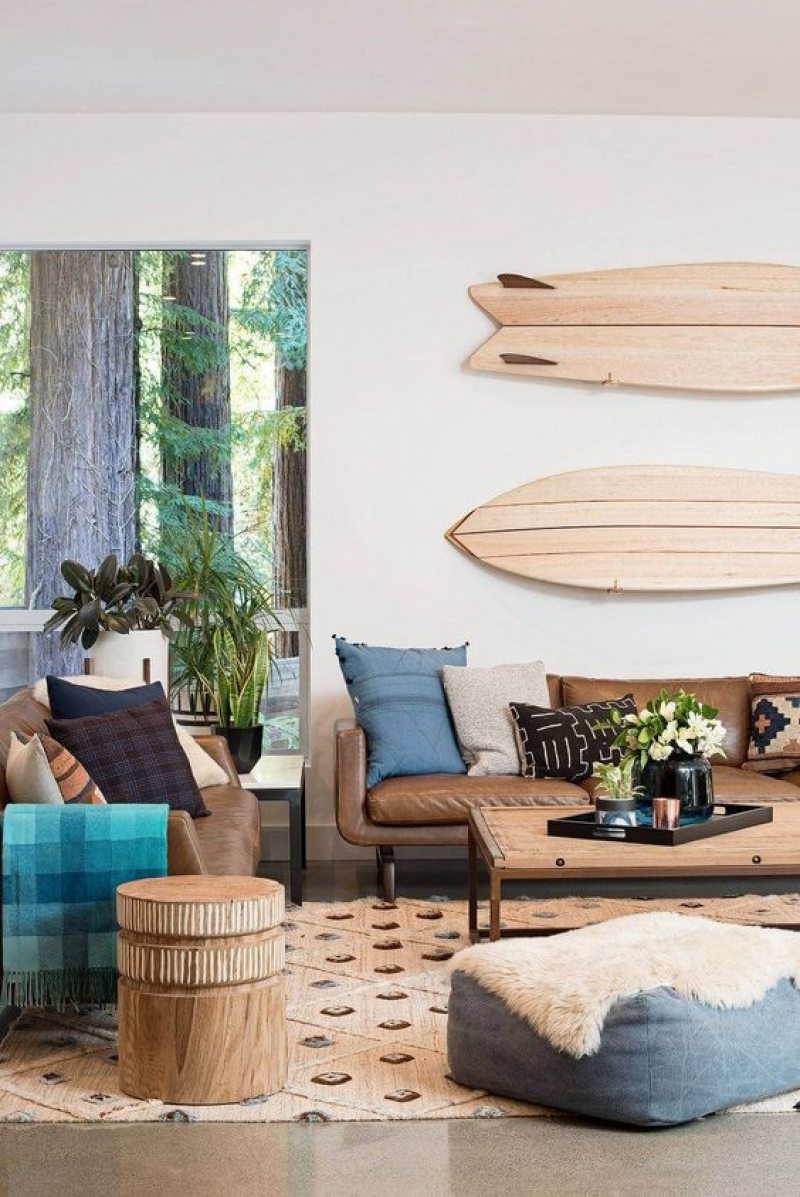 Se alguém da casa gosta de surfar uma boa ideia é utilizar as pranchas também na decoração - fica super bacana!