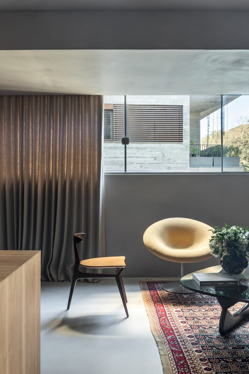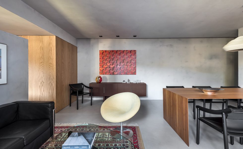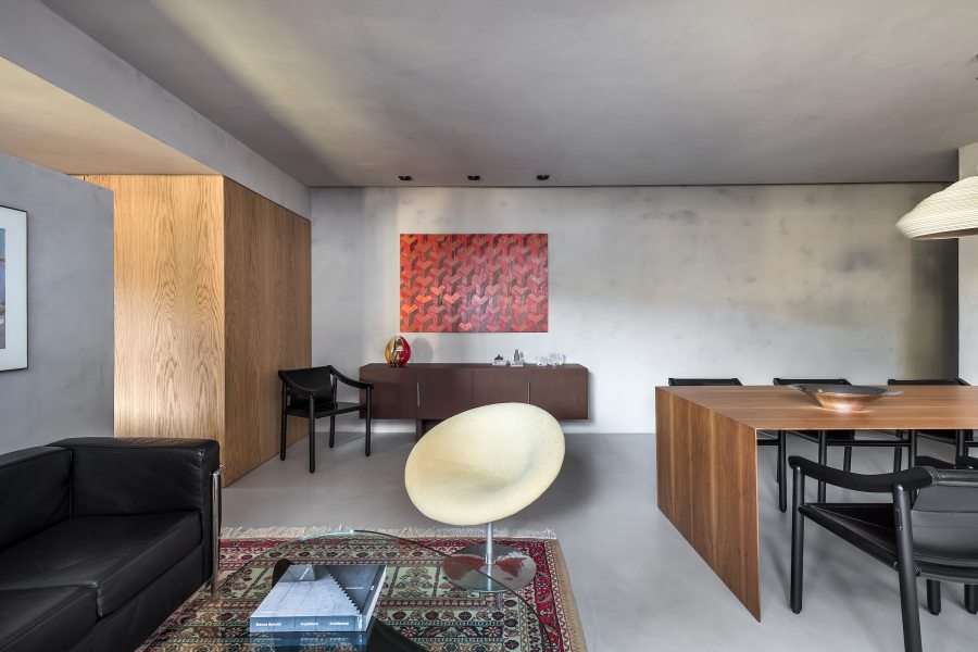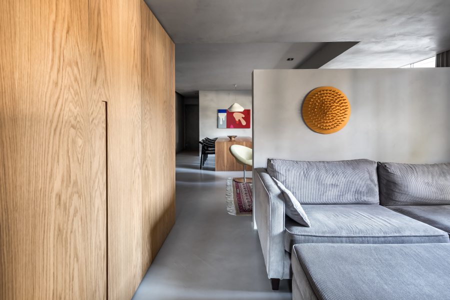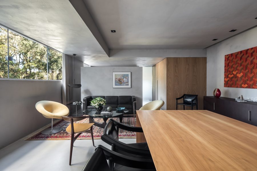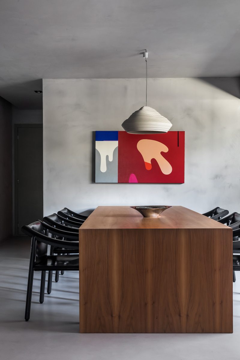 O microcimento cinza sasha, aplicado em todas as superfícies, unificou os diversos ambientes por meio de um pano de fundo neutro e arquitetônico, deixando o destaque por conta das obras de arte em tons vibrantes.