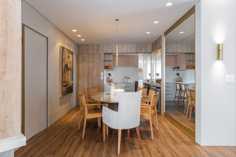 “Como fizemos a obra durante a pandemia e tínhamos urgência, precisávamos trabalhar com revestimentos a pronta entrega. O atendimento ágil da Impermix, aliado à variedade de opções e amplo showroom, nos ajudou muito com o orçamento e com a escolha dos produtos” – elogiou a arquiteta. O décor da sala de estar incorporou móveis clássicos, remanescentes do antigo apartamento, a peças de design contemporâneo, como as mesinhas de centro em formas geométricas. A mistura criou uma estética acolhedora e atemporal, valorizada por elementos sofisticados como a lareira de mármore branco Paraná Nuvolatto.