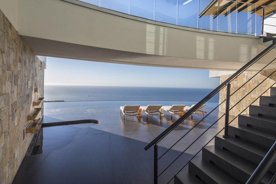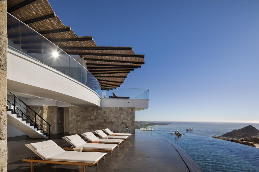 O avanço do terraço superior oferece sombreamento natural, e a piscina estreita acompanha toda a borda frontal, criando uma lâmina d’água contínua em direção ao mar — cenário onde é comum observar baleias em movimento durante determinadas épocas do ano.
