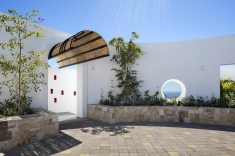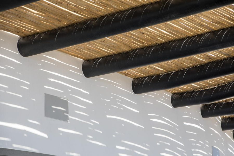 A estratégia da casa começa pelo gesto estrutural: a residência se aprofunda na terra para garantir conforto térmico natural em uma região marcada pelo calor intenso. O uso de alvenaria local — pesada, densa e revestida por estuque branco — cria um sistema de massa térmica que mantém os interiores frescos ao longo do dia, enquanto as superfícies claras refletem a luz e reduzem a necessidade de iluminação artificial.