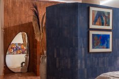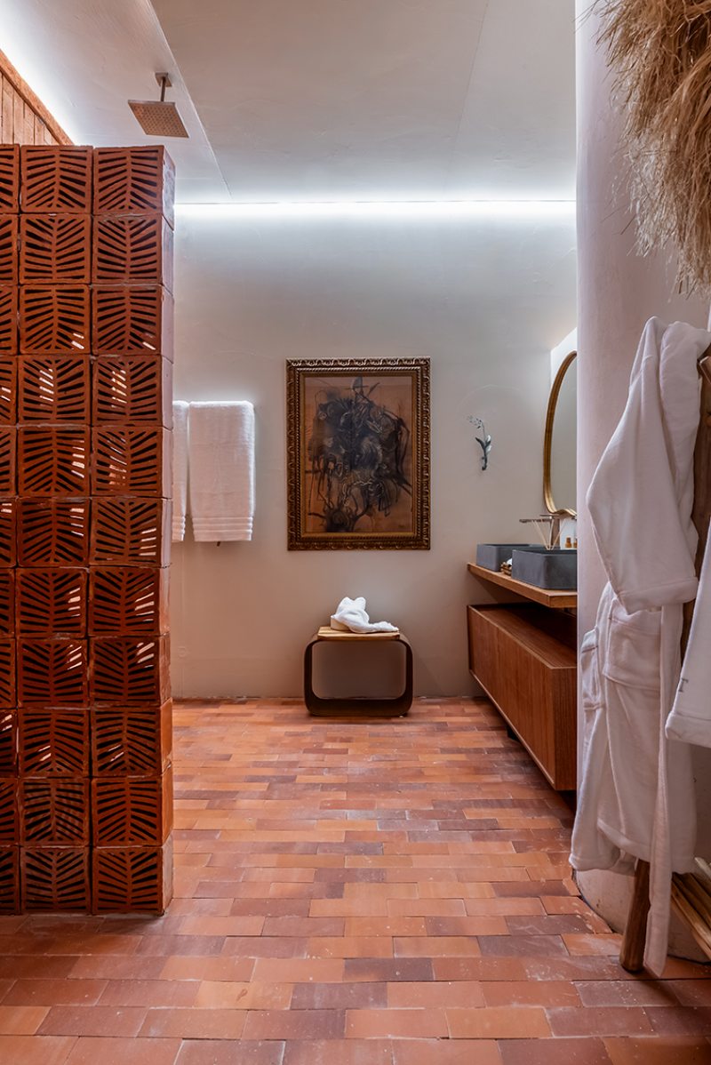 A terra compactada, por exemplo, reaparece em paredes e painéis que mantêm a cor e a densidade do solo. A madeira surge com menos tratamento, revelando veios, nós e variações naturais. Pedras são aplicadas em cortes menos uniformes, deixando visível sua origem geológica.