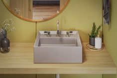 As cubas da linha Platinum possuem bordas finas que trazem leveza para banheiros e lavabos. Na imagem, as louças na cor Beige trazem elegância na medida certa. | Foto: Divulgação Incepa