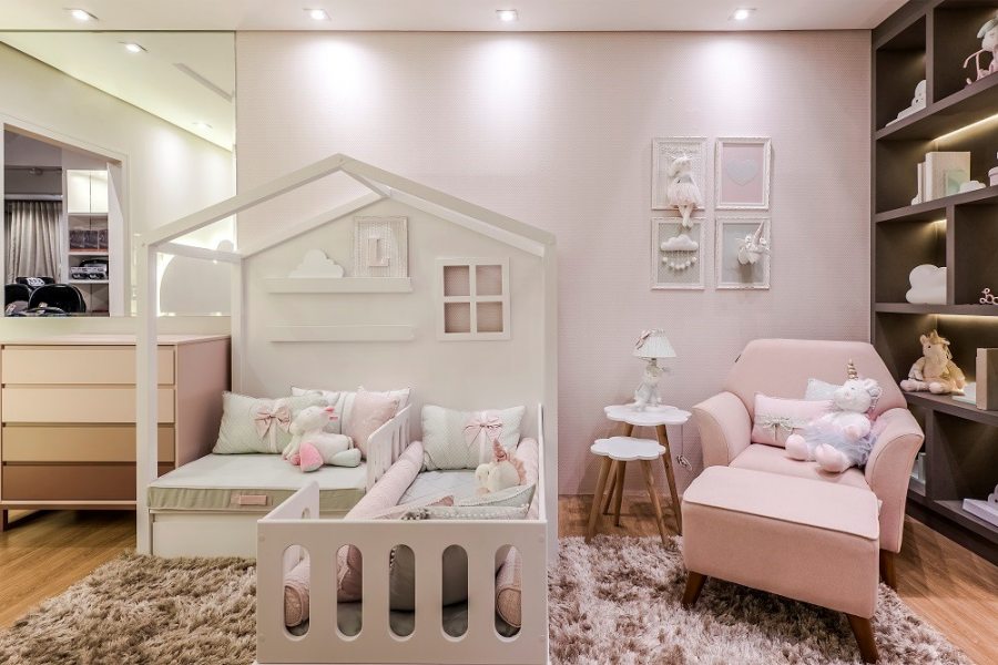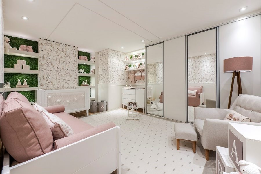 Roberta Bonet criou um quarto de menina moderno com móveis brancos, papel de parede de borboleta e nichos com fundo em vegetação artificial. Além disso, o berço é multifuncional que vai de mini berço a berço normal e caminha.