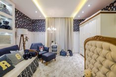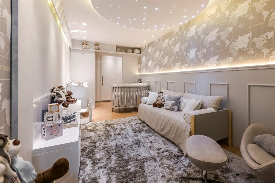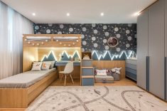 O quarto criado por Fernanda Viero e Keyla Kinder foi personalizado para dois irmãos de idades distintas. A iluminação é feita com fitas de LED embutidas e iluminação em forma de planetas. Destaque para a estante de casinha com rolo de papel e livreiros.
