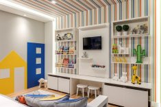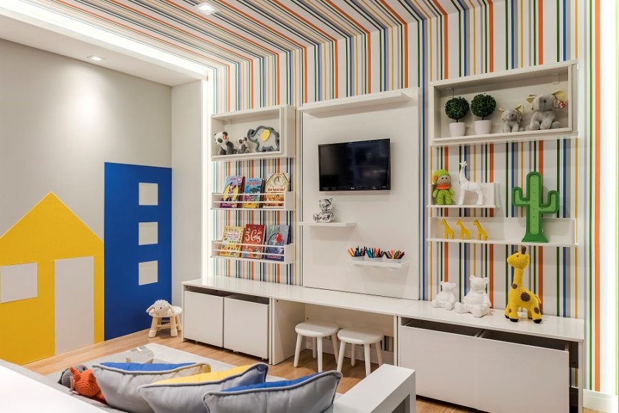 O papel de parede listrado, a parede com marcenaria em forma de cidade e o sofá-cama com espaço para desenhar, ler e brincar ganham destaque pela iluminação.