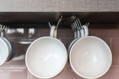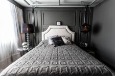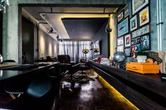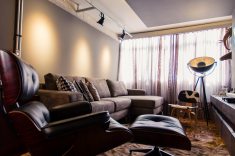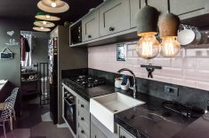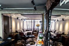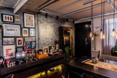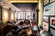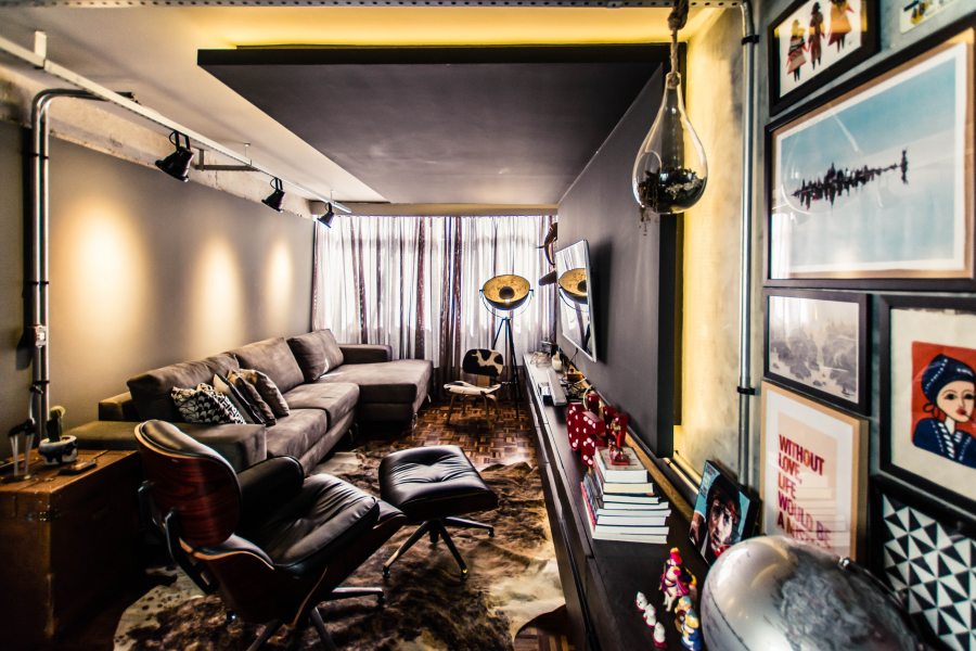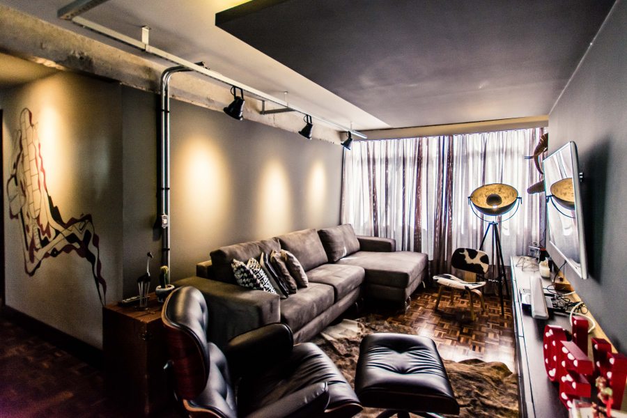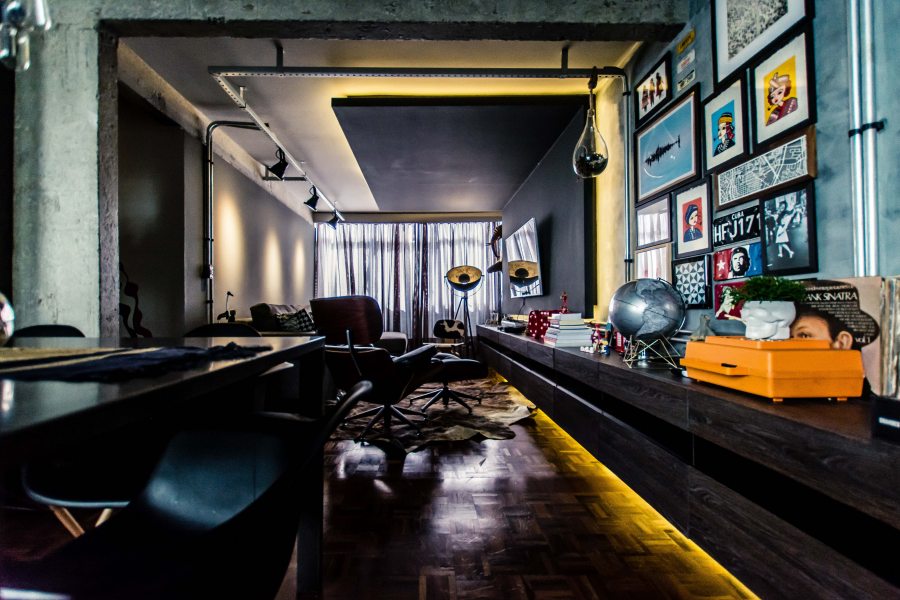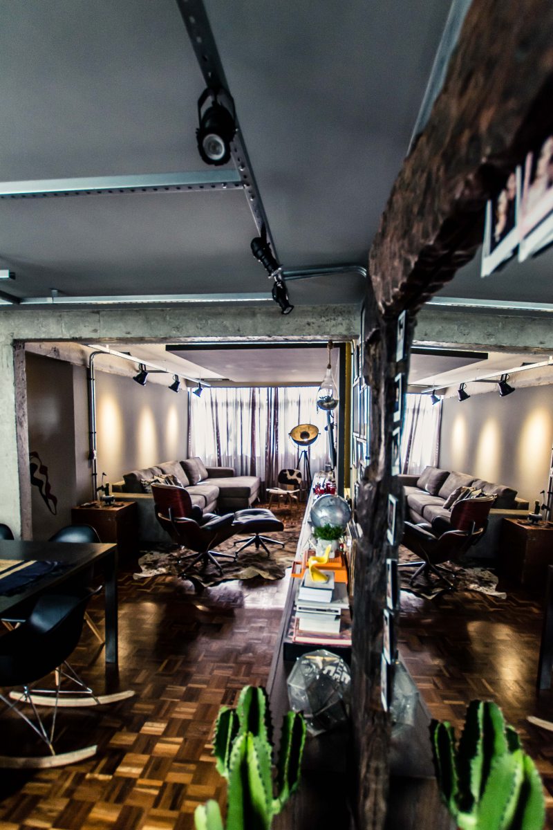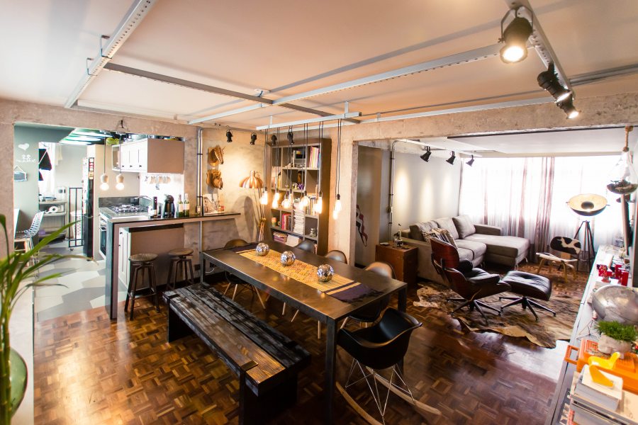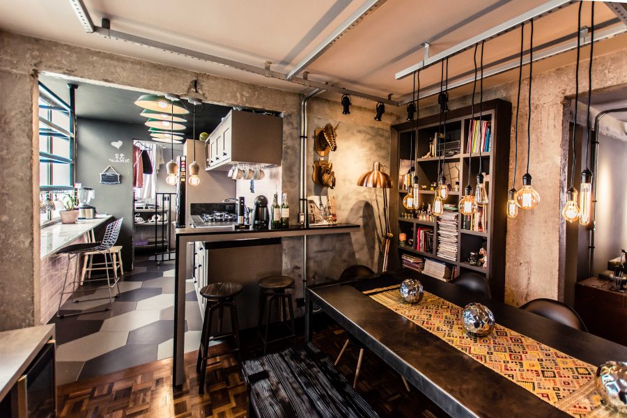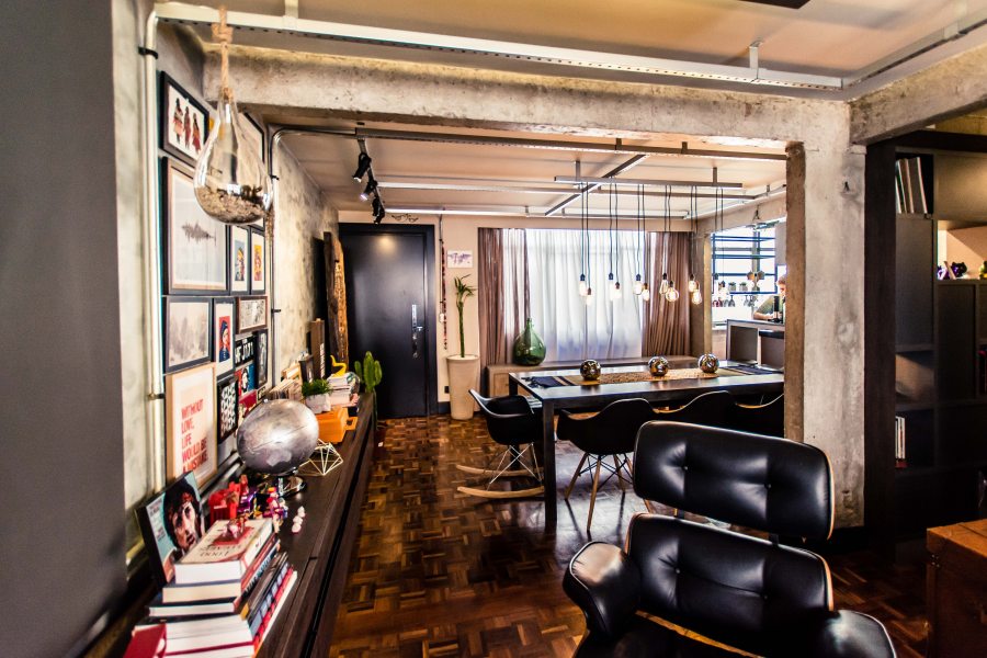 As profissionais Anna Karolinna Venturi e Ana Paula Leal, do Espaço Mais Arquitetura, foram responsáveis pela renovação do apartamento de 85 m², no bairro Portão em Curitiba. O piso em taco de madeira, original do imóvel, foi mantido a pedido do cliente. A estética industrial é vista nos eletrodutos aparentes e nos materiais rústicos, como o concreto.