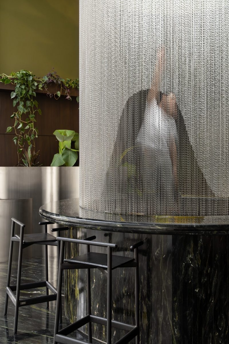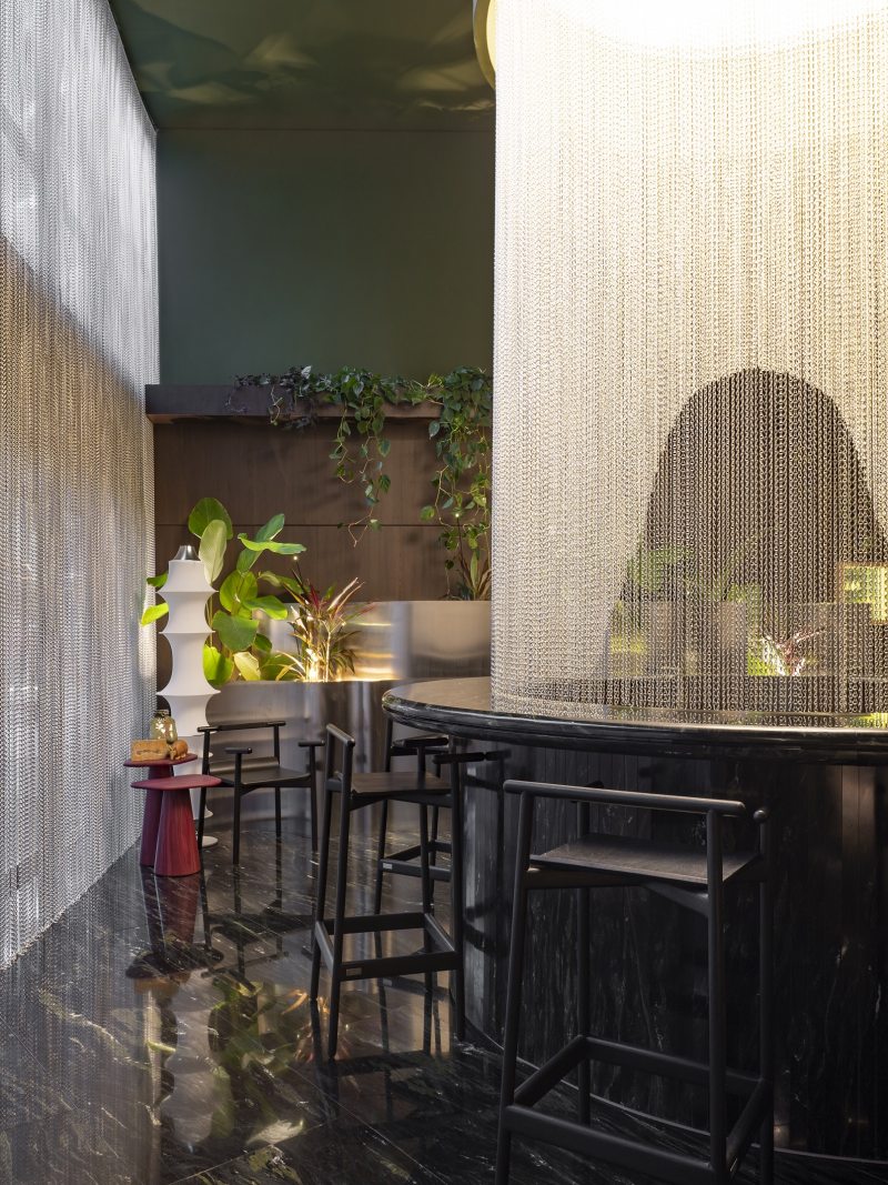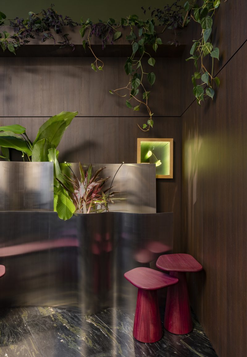Nas paredes as imagens botânicas de Walmor Corrêa dividem espaço com espelho orgânico de Rodrigo Ohtake enquanto do teto caem plantas naturais do paisagismo de Laura Rotter, tudo isso voltado para o bar central do espaço completamente cercado numa cortina de correntes de aço. Segundo a sócia e irmã de Jeferson Branco, Letícia Branco, "o ambiente deve promover um momento de reflexão para quem visitar a CASACOR e esperamos que, mais que apenas apreciar, o visitante busque entender a mensagem que tentamos passar alinhando formas, conceitos, materiais e profissionais do passado, presente e futuro".