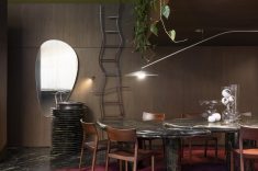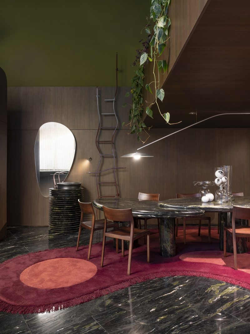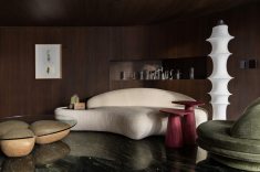 Entre os elementos de passado, presente e futuro que coexistem harmoniosamente no projeto [t3chno.DELTA] estão um sistema de automação de cabeamento desenvolvido por alunos da PUC de São Paulo, luminária italiana desenhada em 1964 por Bruno Munari, banquetas contemporâneas de Leonardo Zanatta, designer Forbes Under 30, um sofá de Victor Vasconcelos, mesas de apoio Pangea em madeira roxinha assinadas pelo próprio Jeferson, que também assina o tapete da coleção Protozoa. Tudo isso, enquanto o uso de Speranza, um quartzo exótico extraído no Brasil, remete ao que há de mais natural e o aço escovado aplicado em algumas áreas do projeto traz a relação com o futurismo e a tecnologia. E com esta composição visual meio Jetsons e meio Flintstones, fica claro que o pântano é um cenário fértil onde a vida nasce, evolui e adapta-se (não necessariamente nesta ordem).
