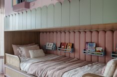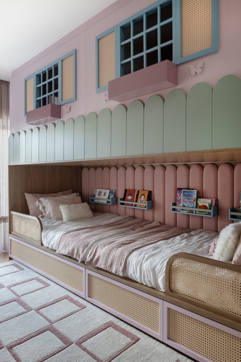 Os ambientes destinados às crianças são perfeitos para investir na tendência Barbiecore. Este quarto pertence a duas irmãs, de 3 e 5 anos, que dividem o dormitório porque gostam muito de brincar juntas. As pequenas são apaixonadas por bonecas e casinhas. Considerando isso, a arquiteta Samara Barbosa projetou camas lúdicas que remetem às casinhas de bonecas. Diferentes tons de rosa foram combinados às demais cores da paleta candy colors, garantindo alegria e aconchego para o dia a dia da duplinha.