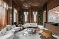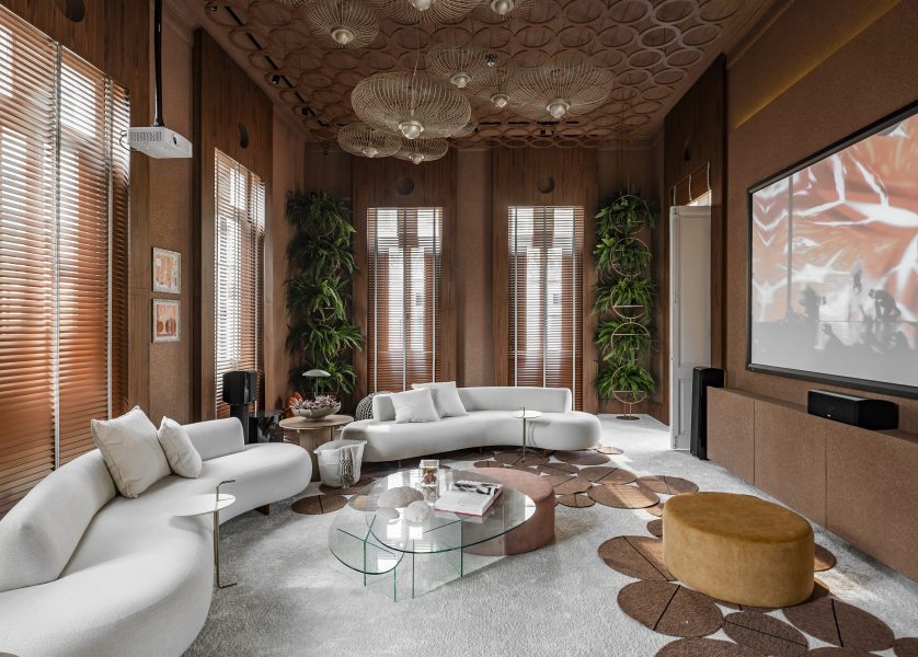 Outra opção é apostar no rosé - variação de rosa mais escuro que também combina com tons neutros. Neste projeto a arquiteta Anna Maya explorou a tonalidade em pontos de cor espalhados pelo ambiente, combinados em uma paleta que vai dos neutros aos terrosos. Esse tom sobre tom resultou em uma arquitetura impactante ao mesmo em que é despojada. O revestimento Pau-Ferro da Sudati, presente nos painéis dispostos por todo o home theater, arrematou o décor.