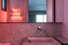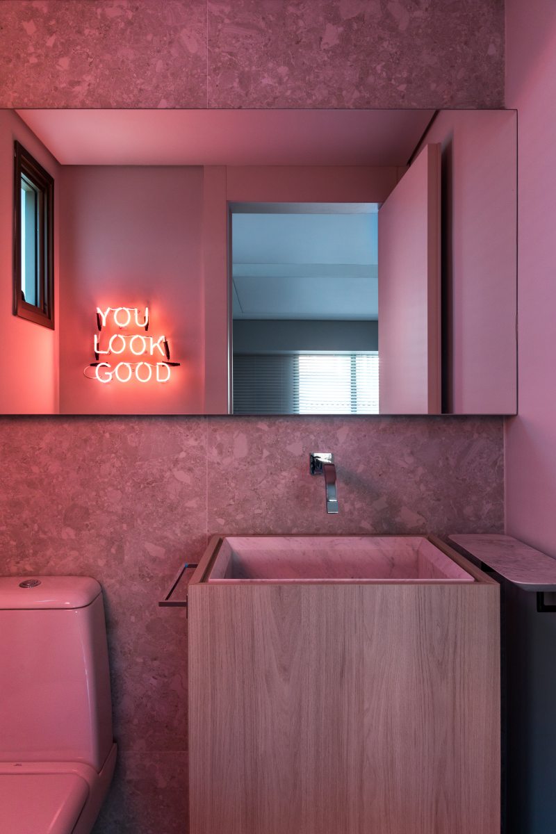 Repleto de personalidade, este consultório oferece uma experiência singular para seus pacientes. Ao entrarem no lavabo, esperando a neutralidade comum às clínicas, os frequentadores se deparam com uma atmosfera Barbiecore com iluminação cénica especial. Assinado pelo escritório BST Arquitetura, o projeto conta com móveis sob medida da Gava Ambientes Completos para aproveitar cada espaço disponível. Para completar o charme da marcenaria, a cuba, revestida em madeira, combinou com o letreiro neon na parede de fundo.