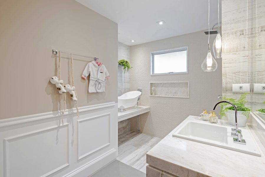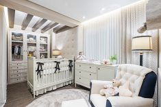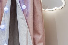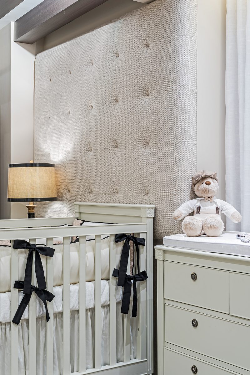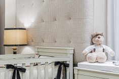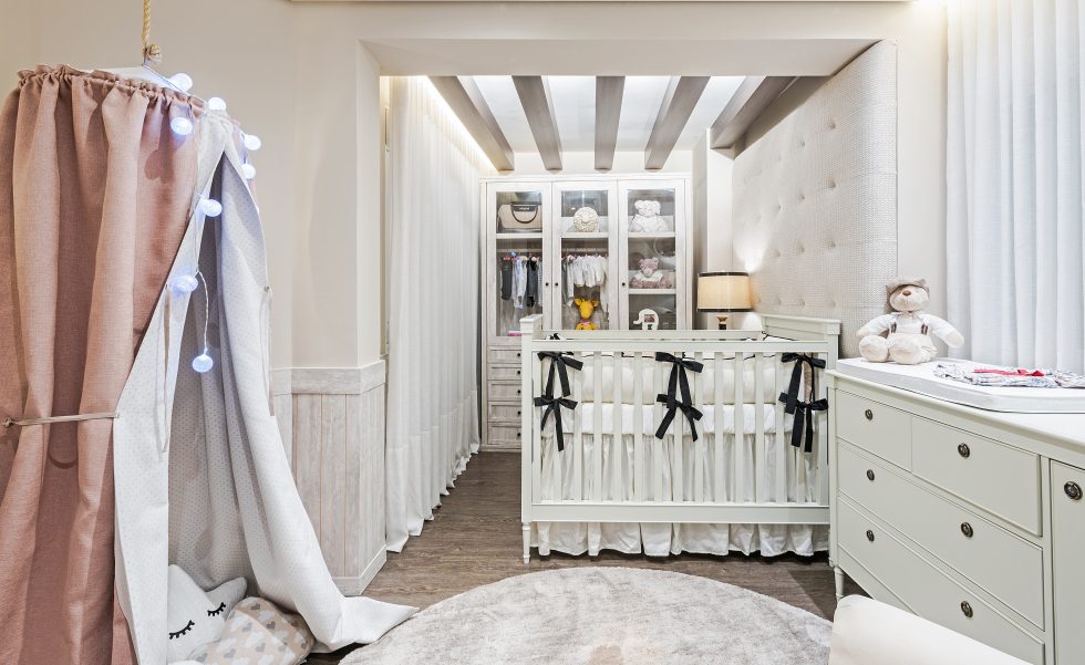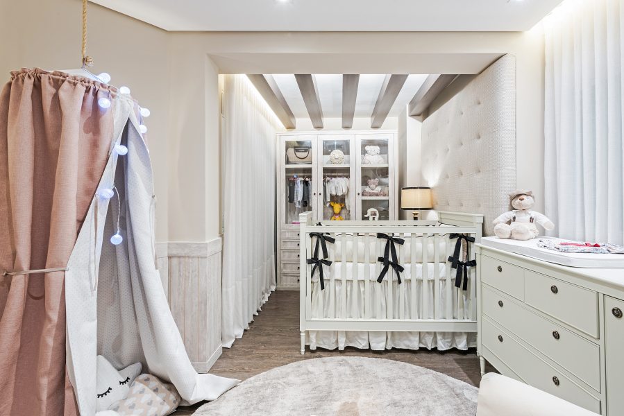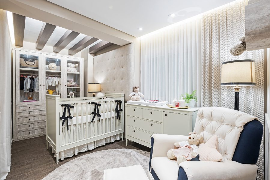 Para o quarto da menina, nada de rosa, princesas ou bonecas. A fim de sair do lugar comum, a designer de interiores Janaína Macedo foi buscar inspiração nas casas do interior da França. A madeira, o linho e o tricô marcam presença no espaço para compor uma atmosfera nostálgica e confortável, de casa da vovó. A marcenaria em MDF que lembra pátina está presente nos lambris das paredes e no roupeiro. Para o luminotécnico, garimpado na GreyHouse, cenários distintos auxiliam a mãe em todas as horas, desde a troca de fraldas e amamentação até a hora de dormir.