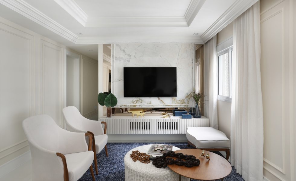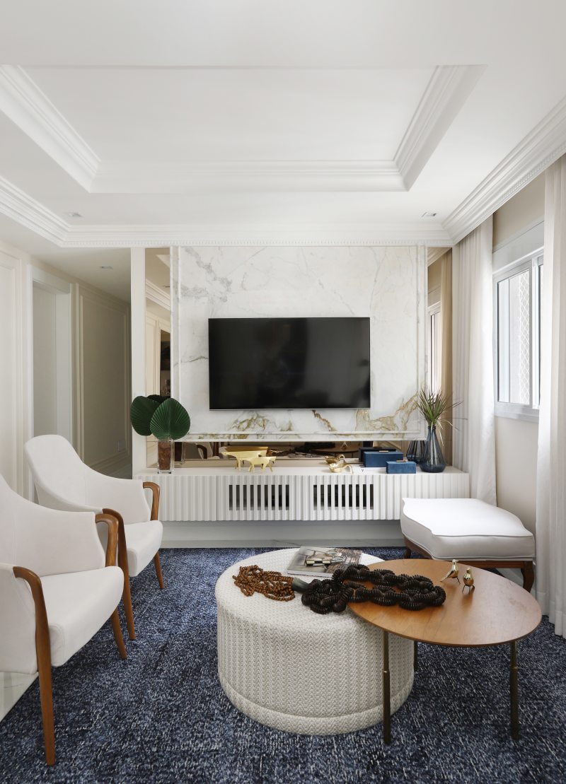 Além de realçar as paredes do living, a arquiteta Gabriela Mendes investiu nas boiseries para enfeitar as paredes da área de circulação na ala íntima do apartamento | Foto: Mari Orsi
