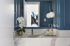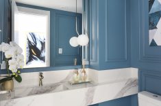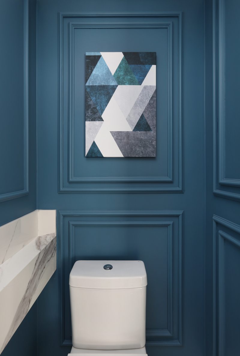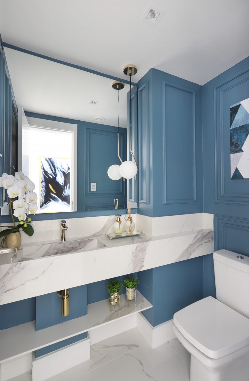 A boiserie deste lavabo é diferente do usual e procura trazer mais profundidade e ampliar o ambiente pequeno. Da linha de fora para a linha de dentro, existe o mesmo espaçamento da largura do boiserie, trazendo unidade ao projeto e uma tranquilidade no olhar | Foto: Mariana Orsi