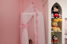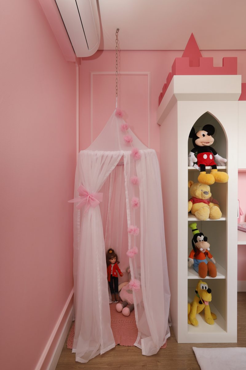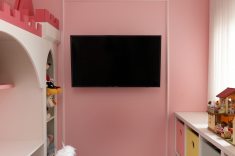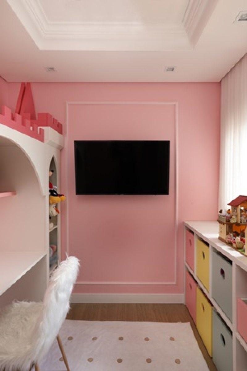 No dormitório infantil, a boiserie ‘delimita’ a TV instalada diretamente na parede, bem como adiciona ainda mais charme para o cantinho das brincadeiras | Foto: Mariana Orsi