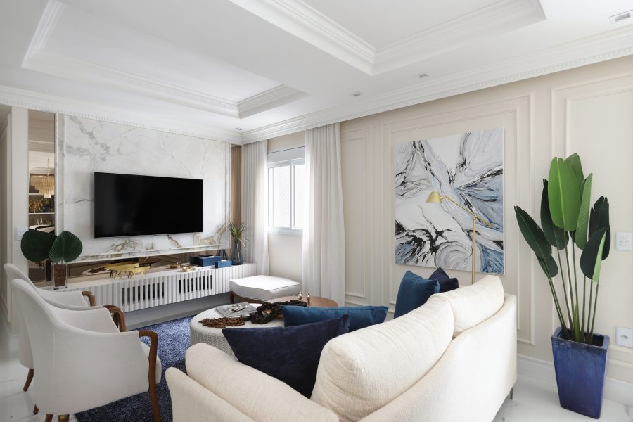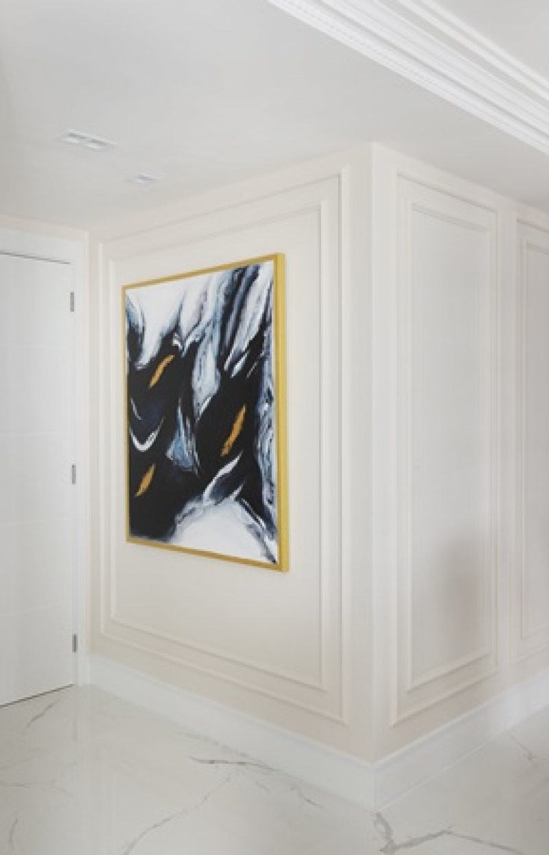 No que diz respeito aos formatos, o projeto de interiores pode contar com aplicações mais trabalhadas, largas, retas ou até mesmo curvas. Segundo a arquiteta, as boiseries podem ser aplicadas em todo perímetro da parede ou apenas em uma parte delas. Linhas retas e simples, sem muitos detalhes, são perfeitas para compor uma estética mais contemporânea, enquanto um desenho não convencional (quadrado ou retangular) produz um décor mais moderno e divertido.