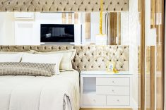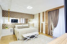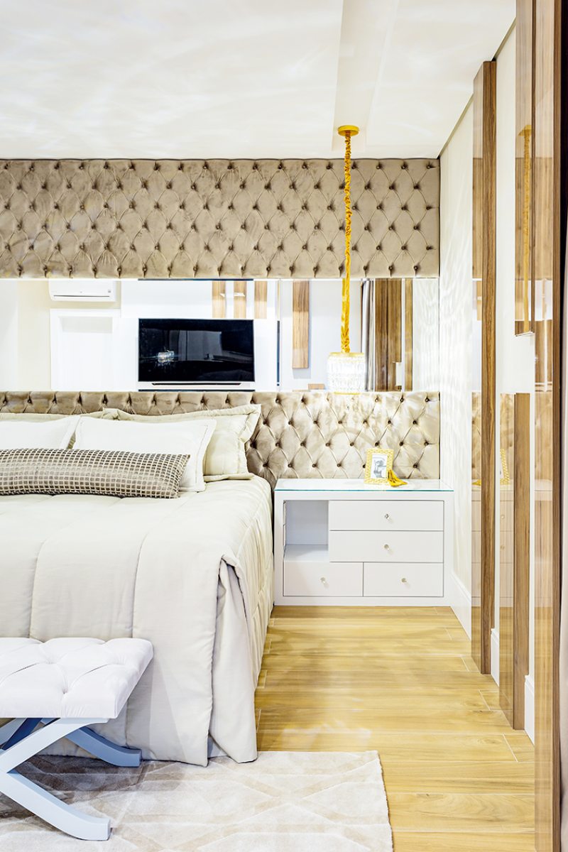 A cabeceira estofada em capitonê ocupa toda a extensão de uma das paredes e é suavizada pelo detalhe em espelho que amplia a luminosidade natural e sensação de amplitude do quarto. A madeira aparece tanto no piso (Pastilhart) quanto em detalhes que emolduram as cortinas e xales. O enxoval da Entre Sedas e a iluminação agradável da Grey House, composta por luminárias embutidas e pendentes decorativos, arrematam a decoração.