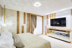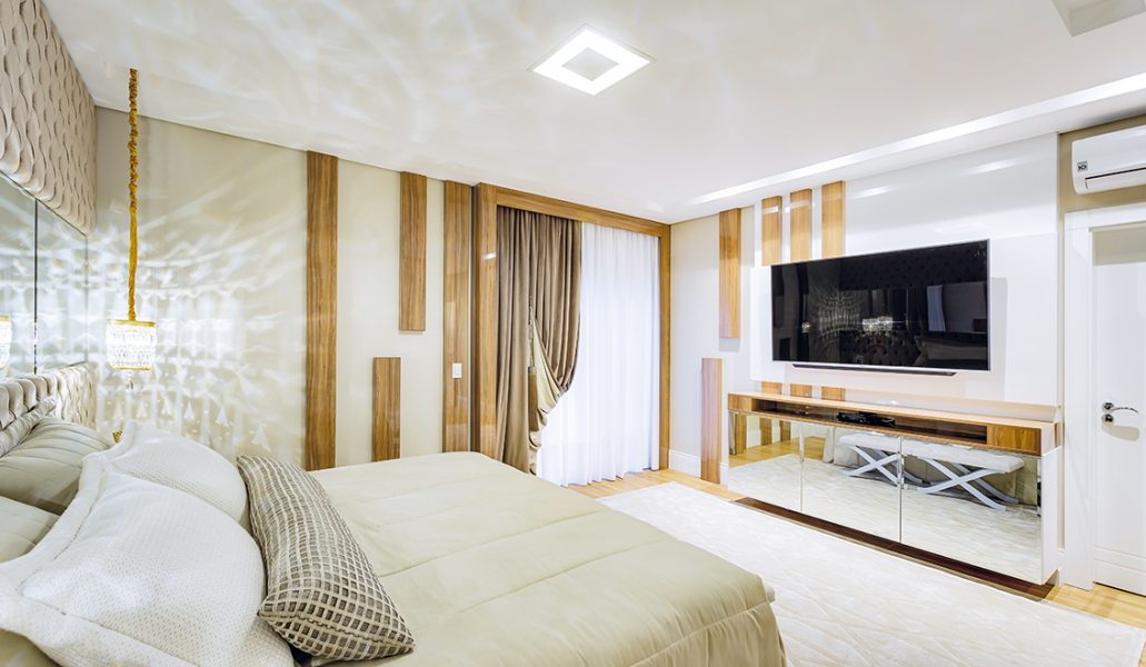 Onde: Curitiba • 21 de Abril - 2020 | Fotos Nenad RadovanovicQuarto do casal ganhou tons quentes, detalhes amadeirados e enxoval sofisticado para relaxar a dois