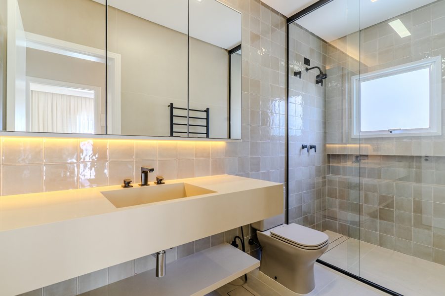 Entre as soluções que vêm ganhando espaço nos banheiros atuais, o box de vidro até o teto se destaca por unir estética e desempenho. A ausência de travessas e perfis aparentes cria uma sensação de continuidade que valoriza o ambiente, além de oferecer um visual limpo e elegante — características muito presentes nos projetos contemporâneos. Essa escolha também favorece a retenção de calor durante o banho, mantendo o espaço mais aconchegante e evitando que o vapor se disperse rapidamente, algo especialmente apreciado em regiões frias ou em banheiros com proposta de “spa”.