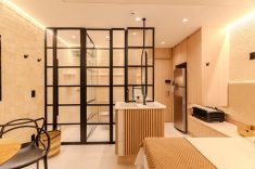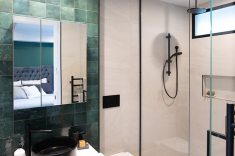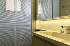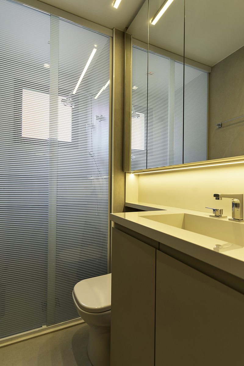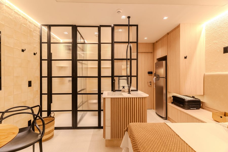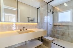A vedação completa também ajuda a conter respingos e infiltrações, mantendo o piso externo mais seco e preservando o revestimento. Por isso, tem sido cada vez mais especificado em obras de alto padrão, principalmente quando a intenção é destacar materiais nobres ou explorar a transparência como elemento de integração visual. No entanto, essa mesma vedação pode se transformar em um ponto de atenção. Sem ventilação adequada — seja por janela, claraboia ou exaustor — o vapor tende a se acumular, elevando o risco de mofo e deterioração dos rejuntes. A observação, contudo, é relativizada pelo arquiteto Marcos Serrano Miralles, que defende que o box com vidro até o teto pode ser perfeitamente funcional quando bem executado. “Apesar da lenda da dificuldade de limpeza do box até o teto, com os produtos certos e uma rotina de manutenção, é possível manter tudo sempre limpo e bonito”, afirma o profissional.