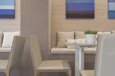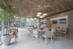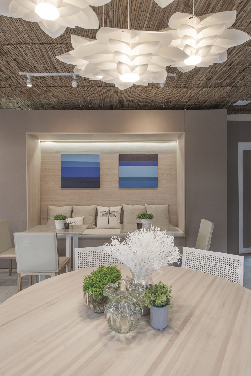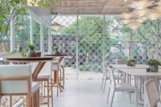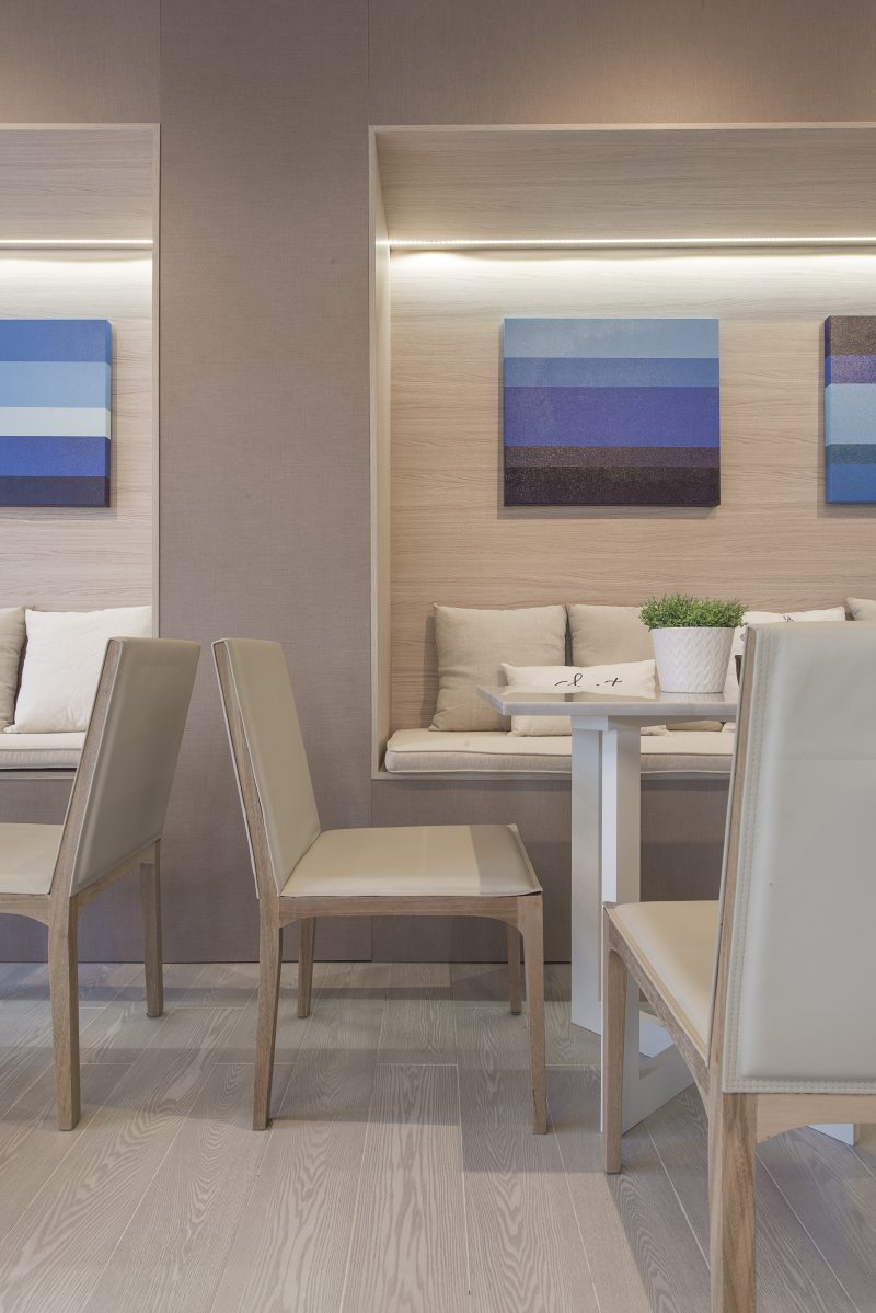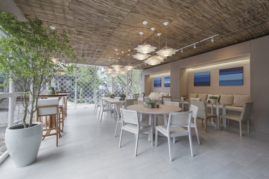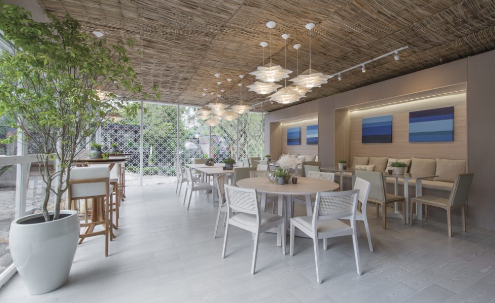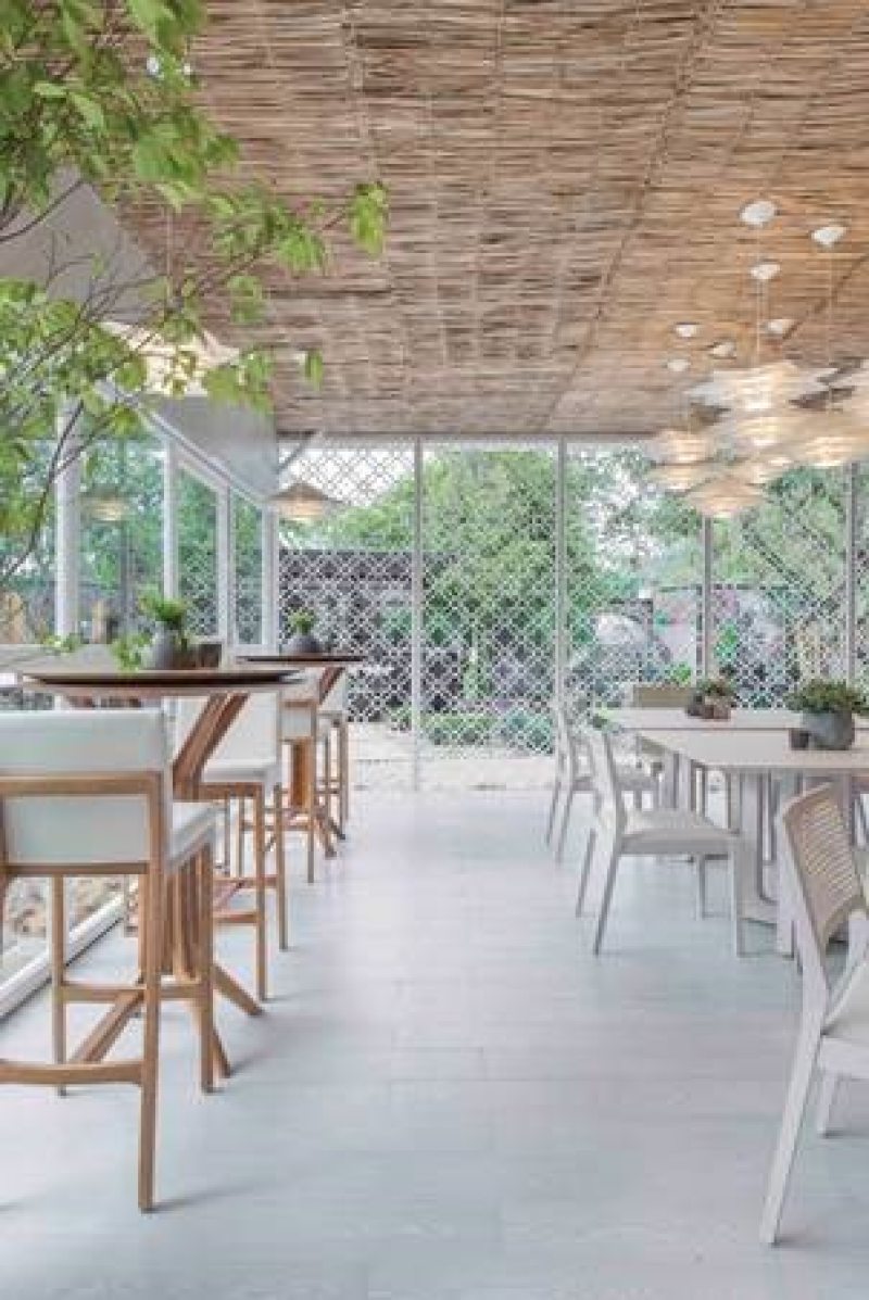 Com linhas retas e estrutura ampla para passagem de luz e ar, o café possui cara de casa. Além disso, as telas representando o azul do céu, mar e lagoa são assinadas pela artista plástica Fabi Loos e contrapõem com a parede de plantas naturais.
