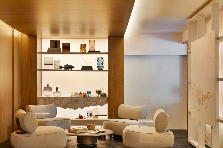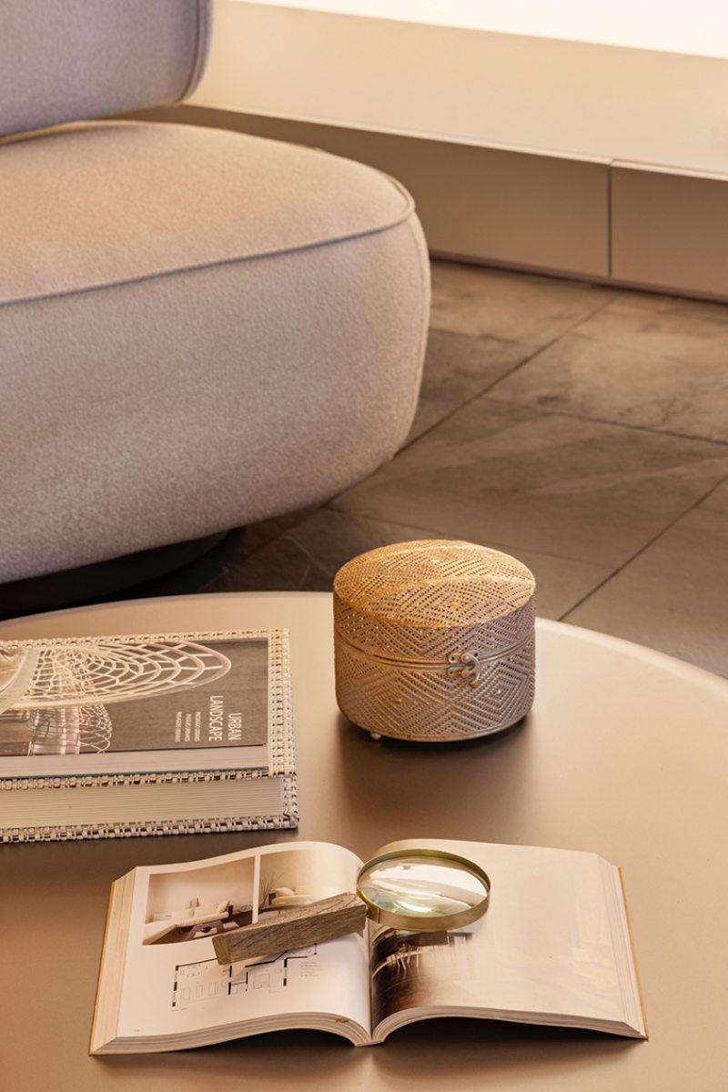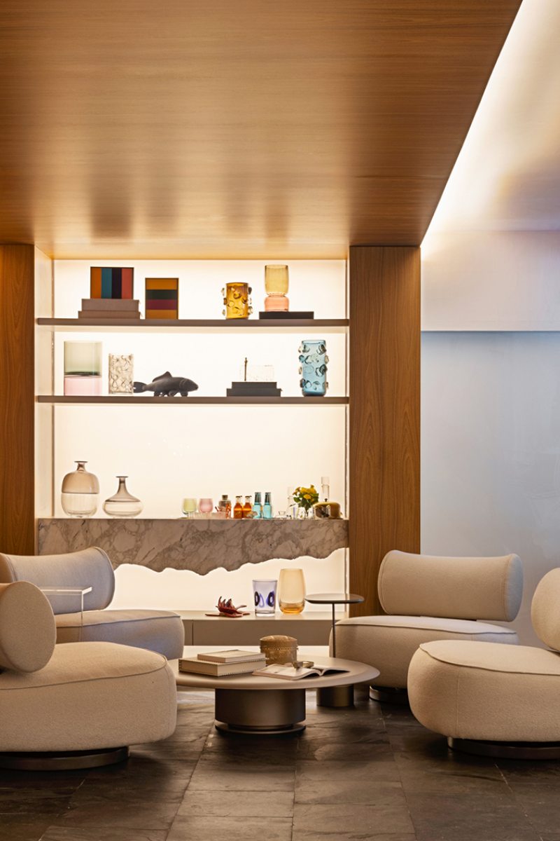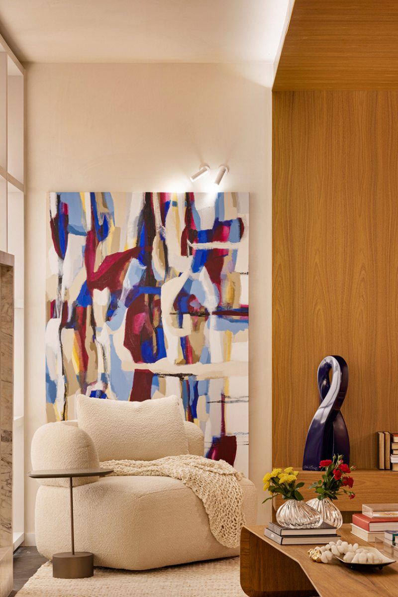 O ambiente evita distrações. É pensado para a convivência, o olhar atento e a reconexão com o tempo interior. “Projetamos a Sala da Lareira como um convite à pausa. Não uma pausa vazia, mas plena, para sentar-se, ouvir, lembrar e simplesmente ser”, define Roberta.