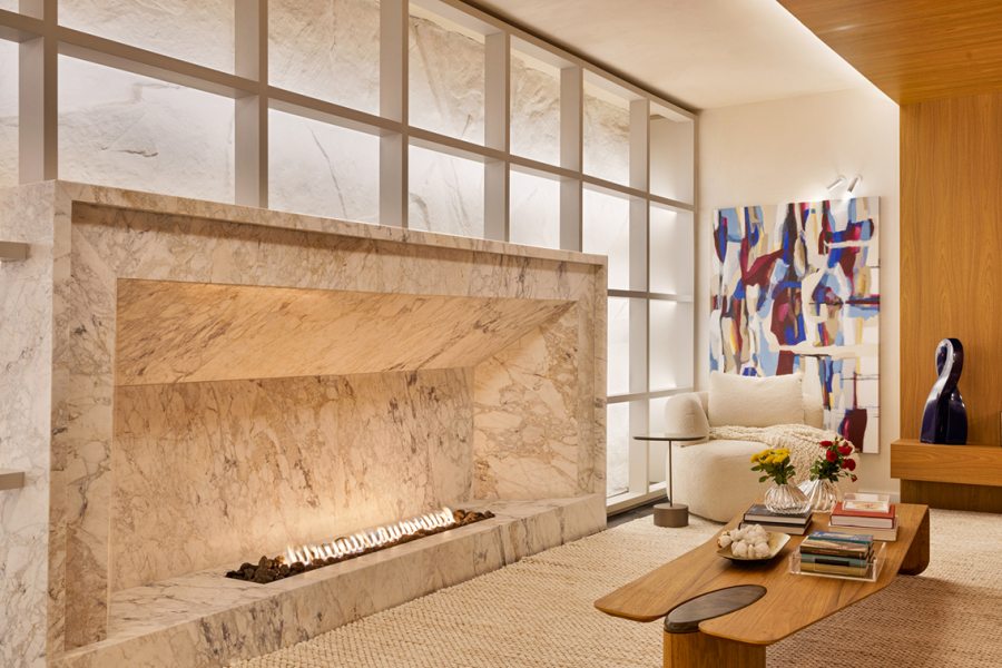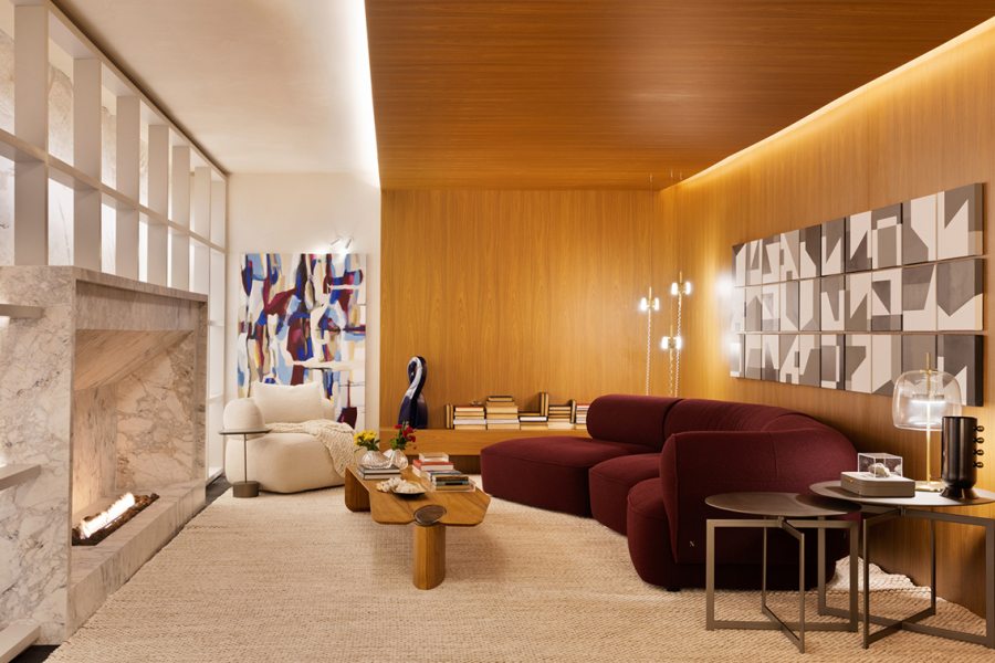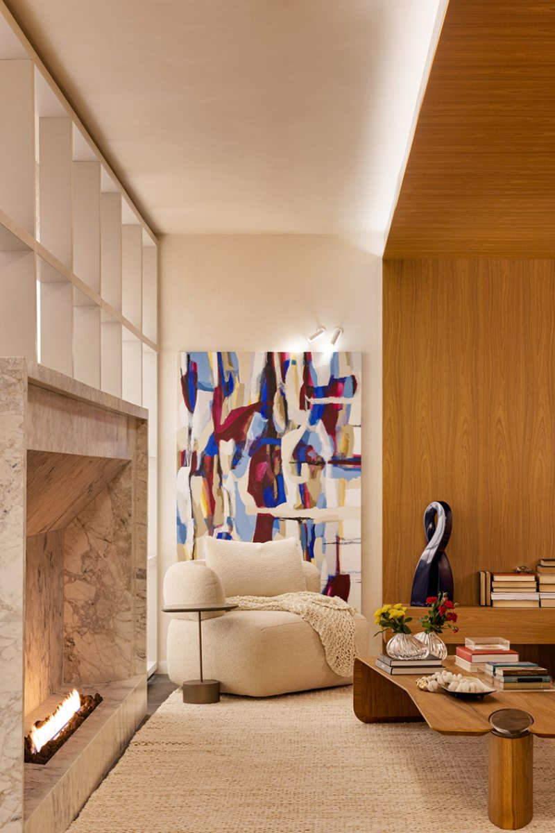A lareira embutida em mármore natural se torna o eixo do projeto. Ao redor dela, a composição é estratégica: móveis baixos, volumes arredondados e materiais táteis criam uma atmosfera de permanência. Um tapete de trama larga delimita o espaço, enquanto uma caixa de madeira envolve teto, piso e parede, formando um abrigo visual que convida à pausa.