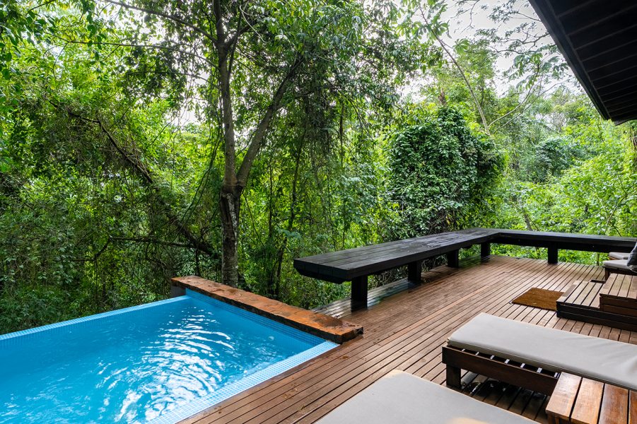 O Awasi Iguazú fica dentro da mata atlântica e oferece acesso reservado a áreas menos movimentadas do parque, além de decks privativos no rio e estruturas suspensas entre as copas das árvores.
