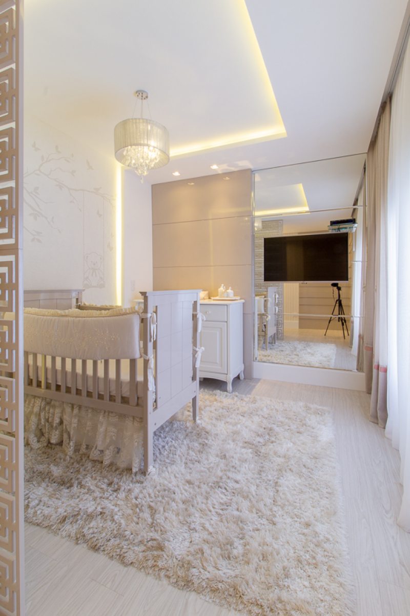 rasgos no gesso, que vão do chão ao teto, e do lustre de cristal e tecido. Em uma das paredes, próxima ao berço, textura lúdica em quartzo, assinada pela artista plástica Marilene Ropelato.